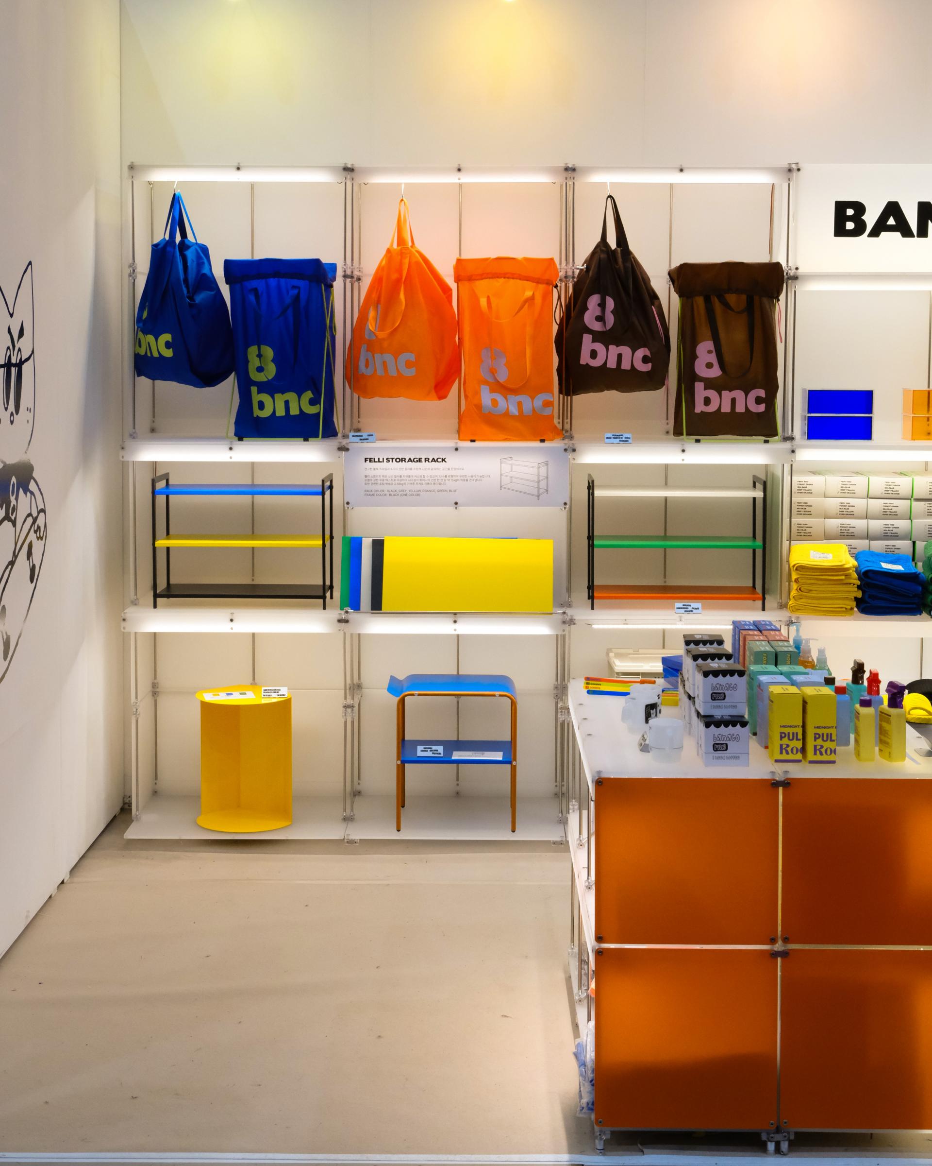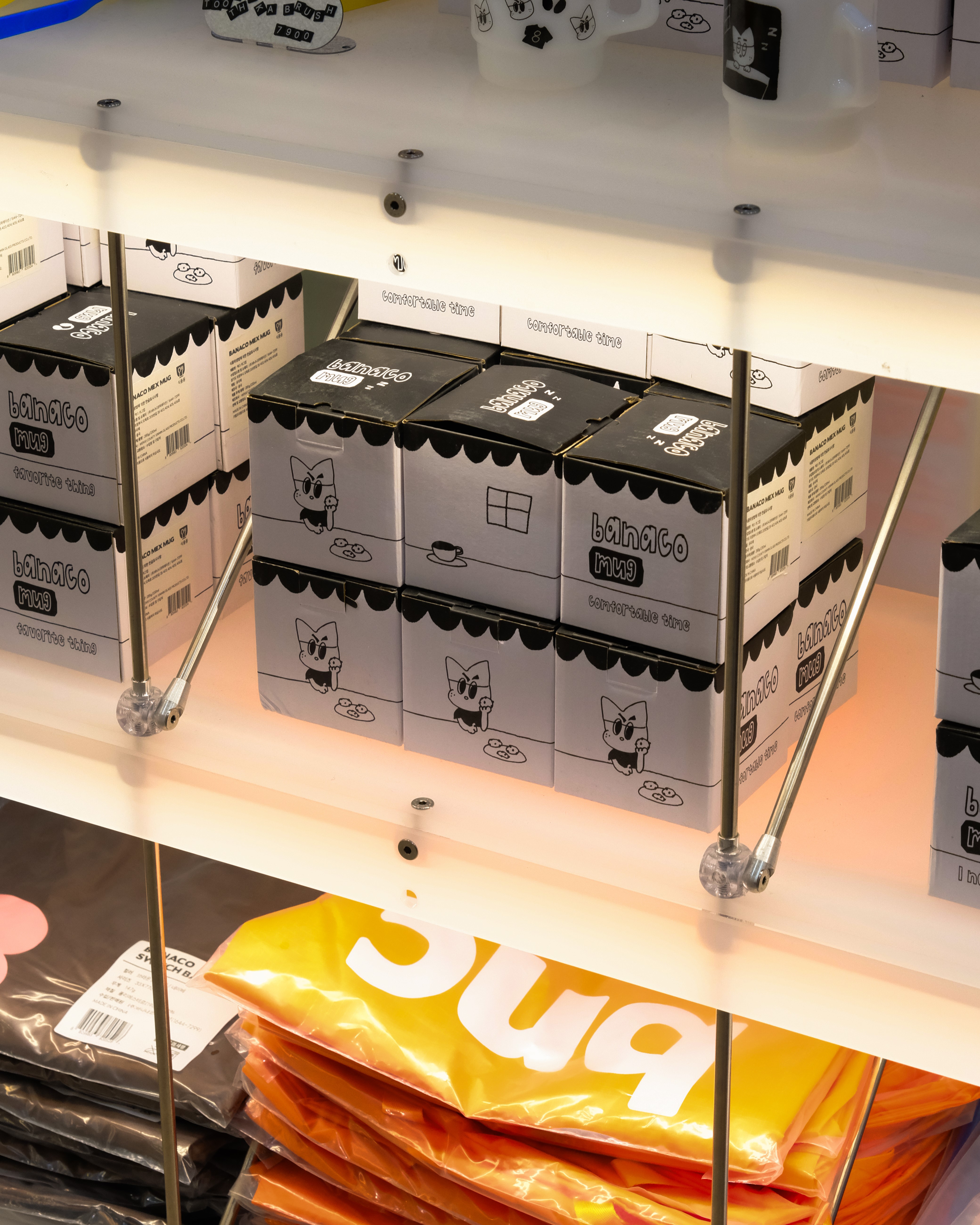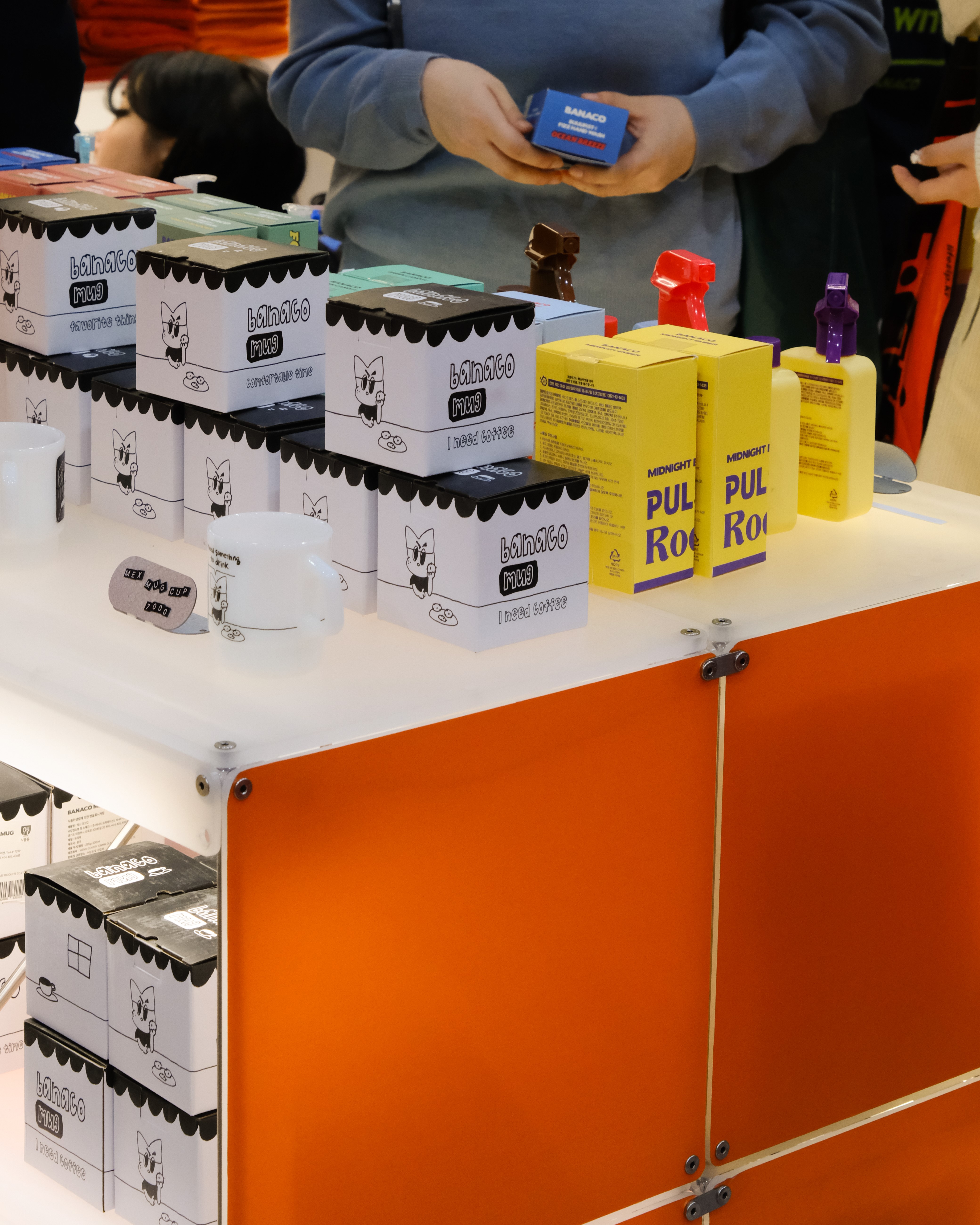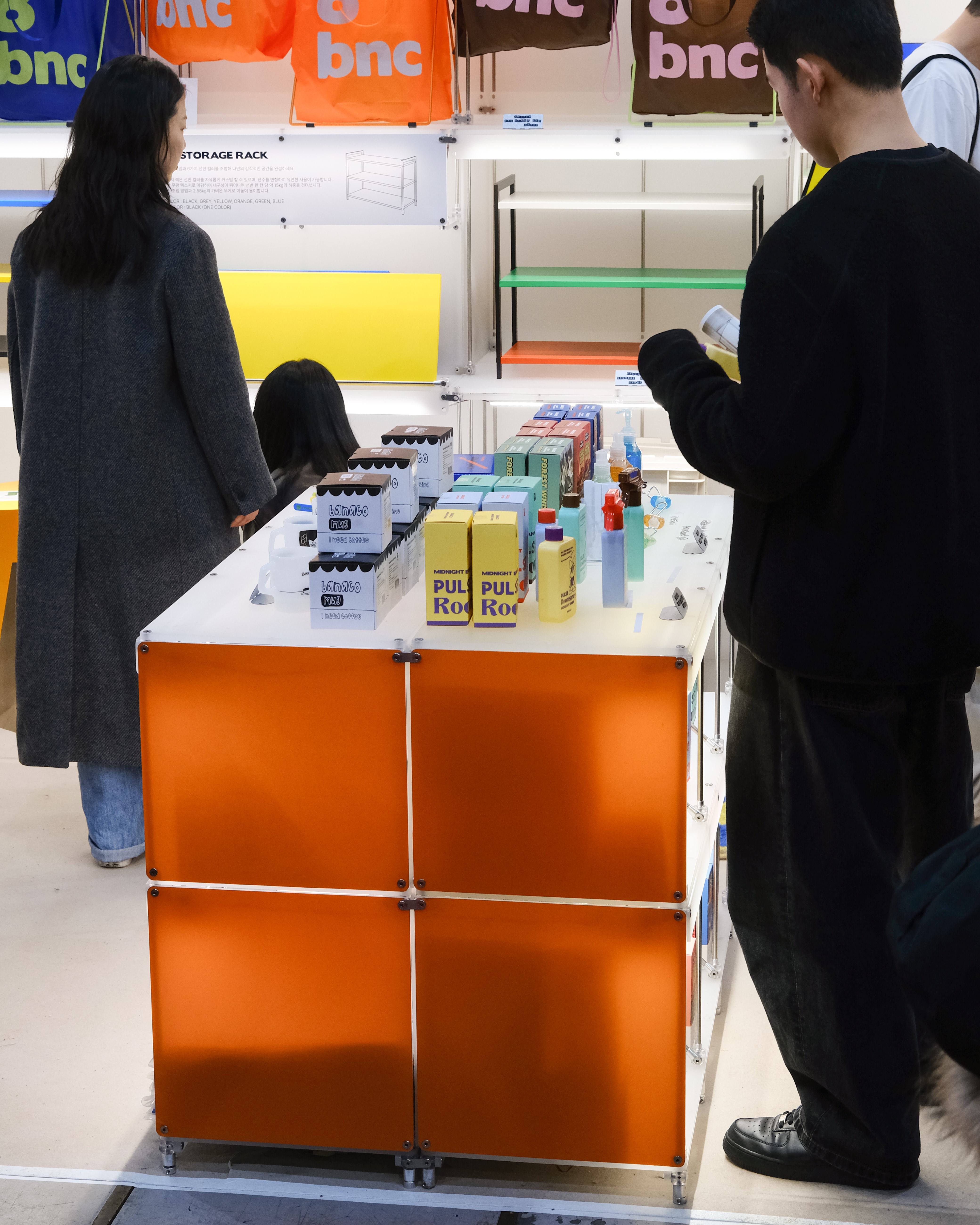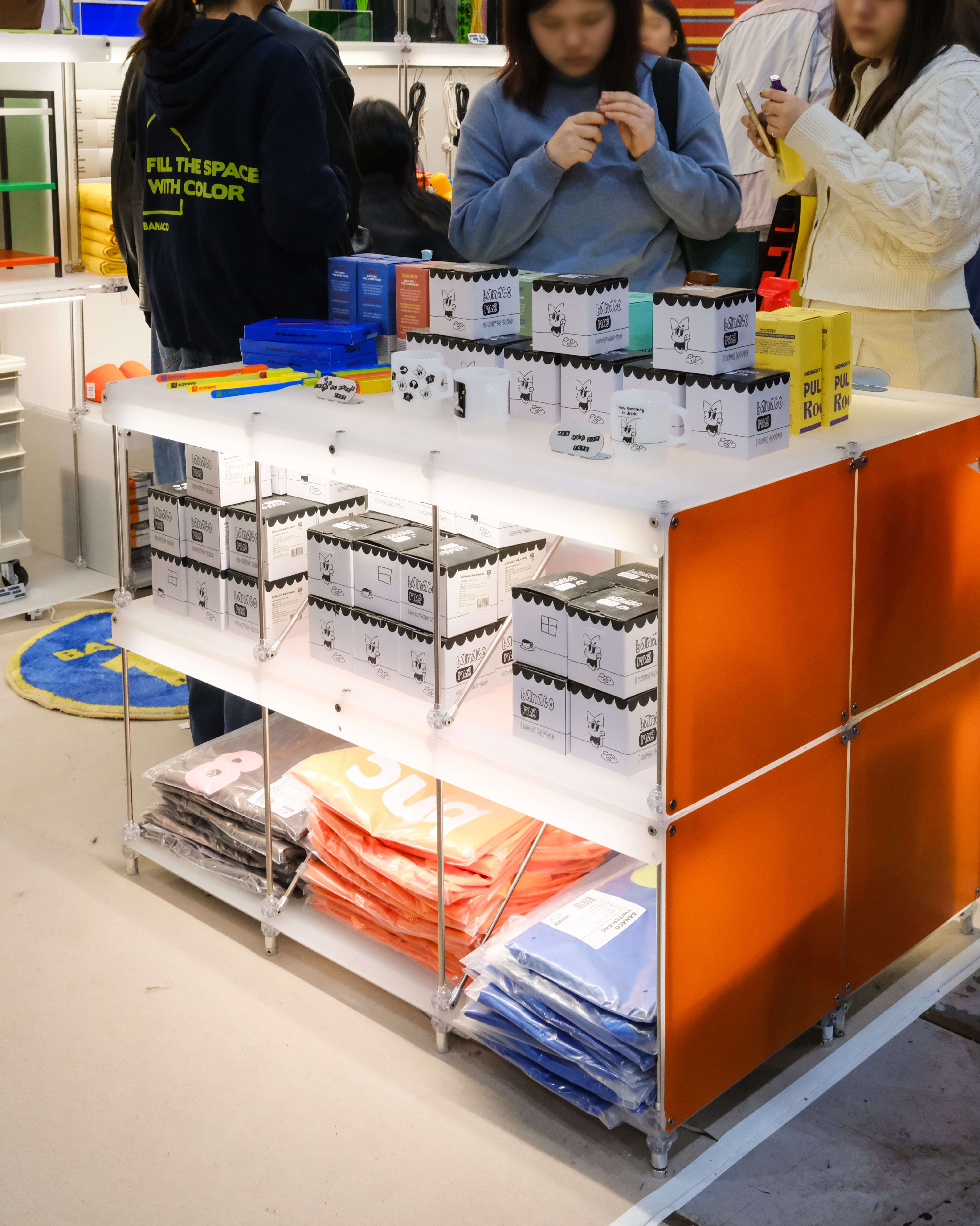 여러 카테고리의 제품을 하나의 브랜드 벽면으로 구성한 진열 시스템