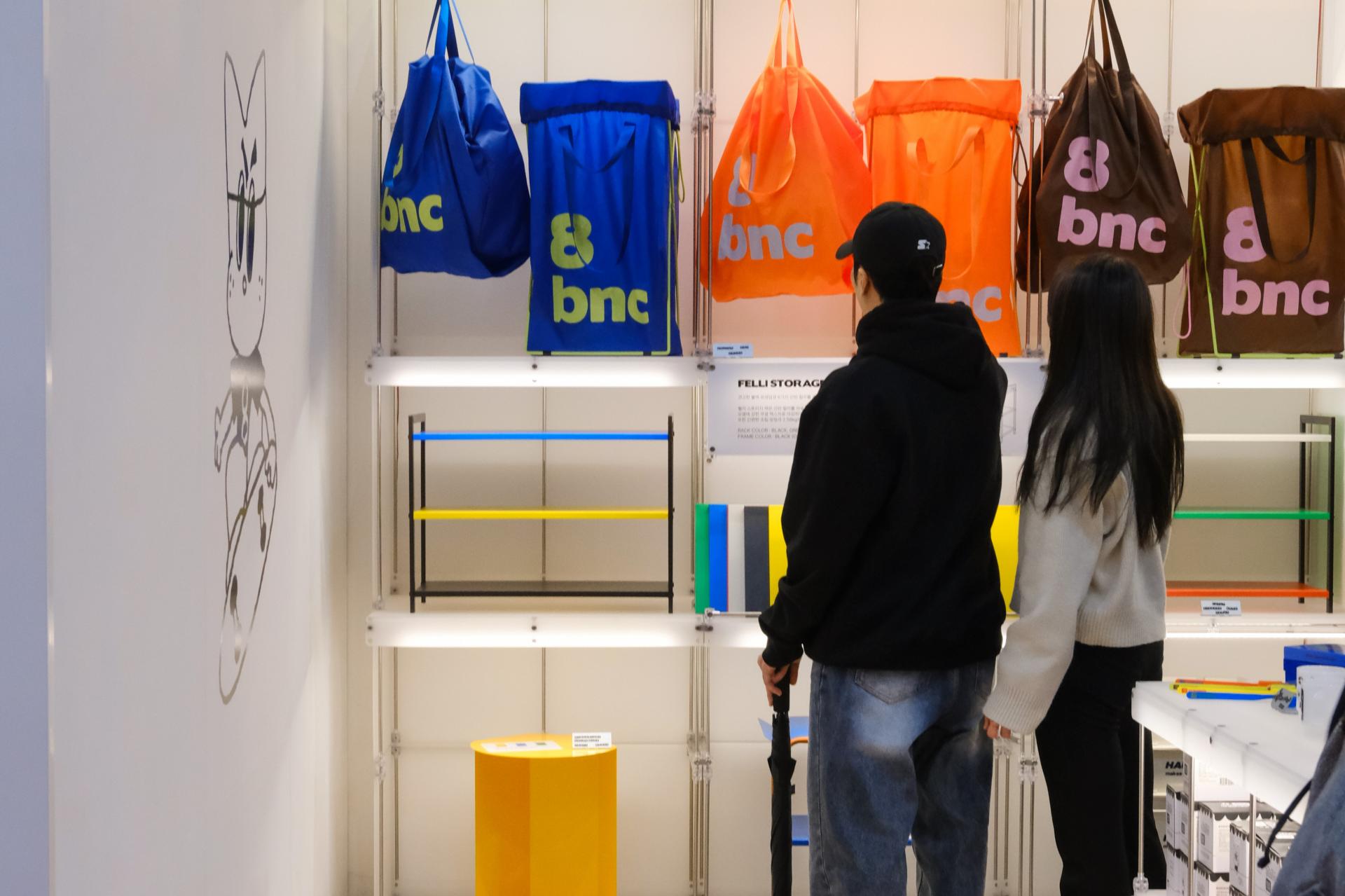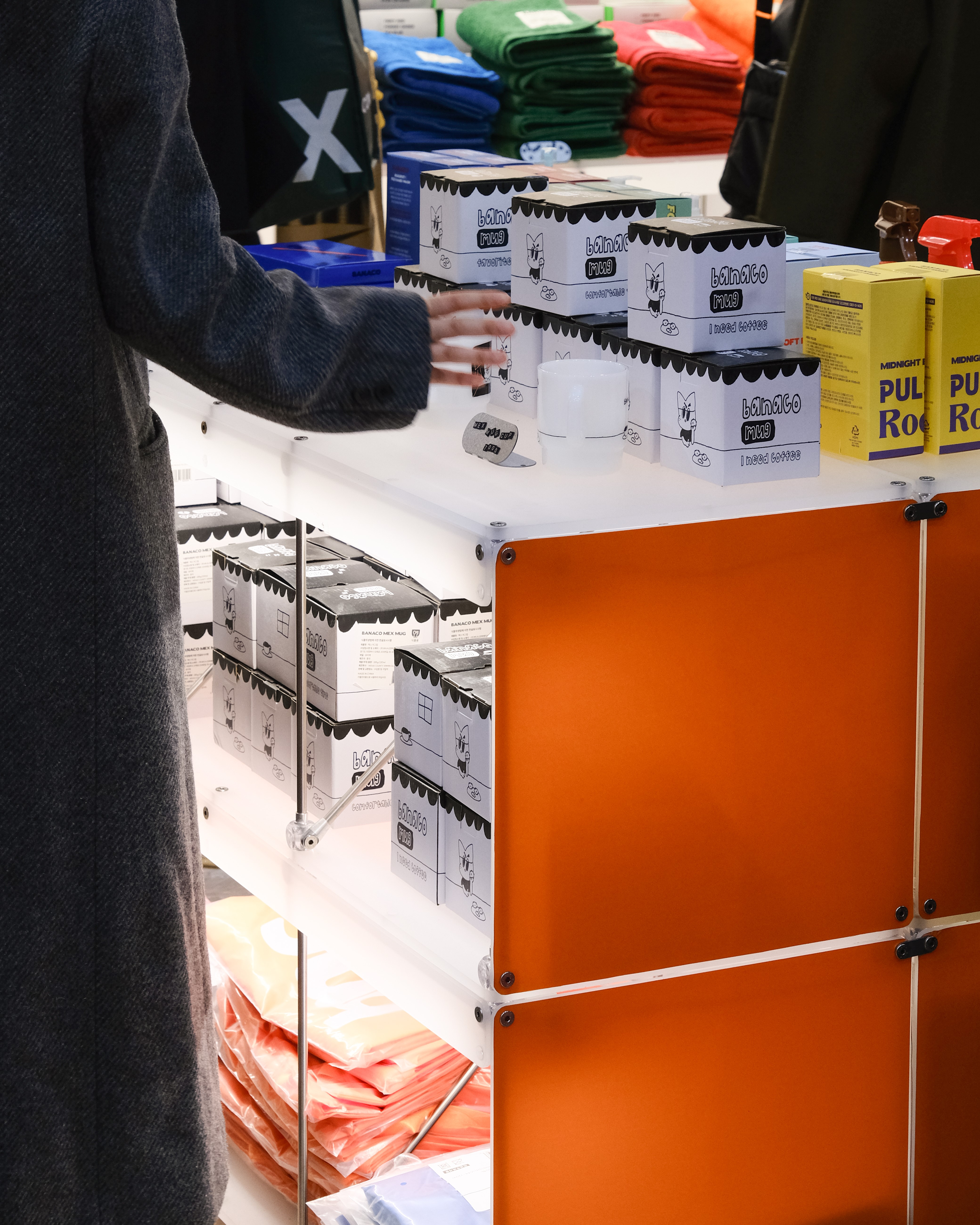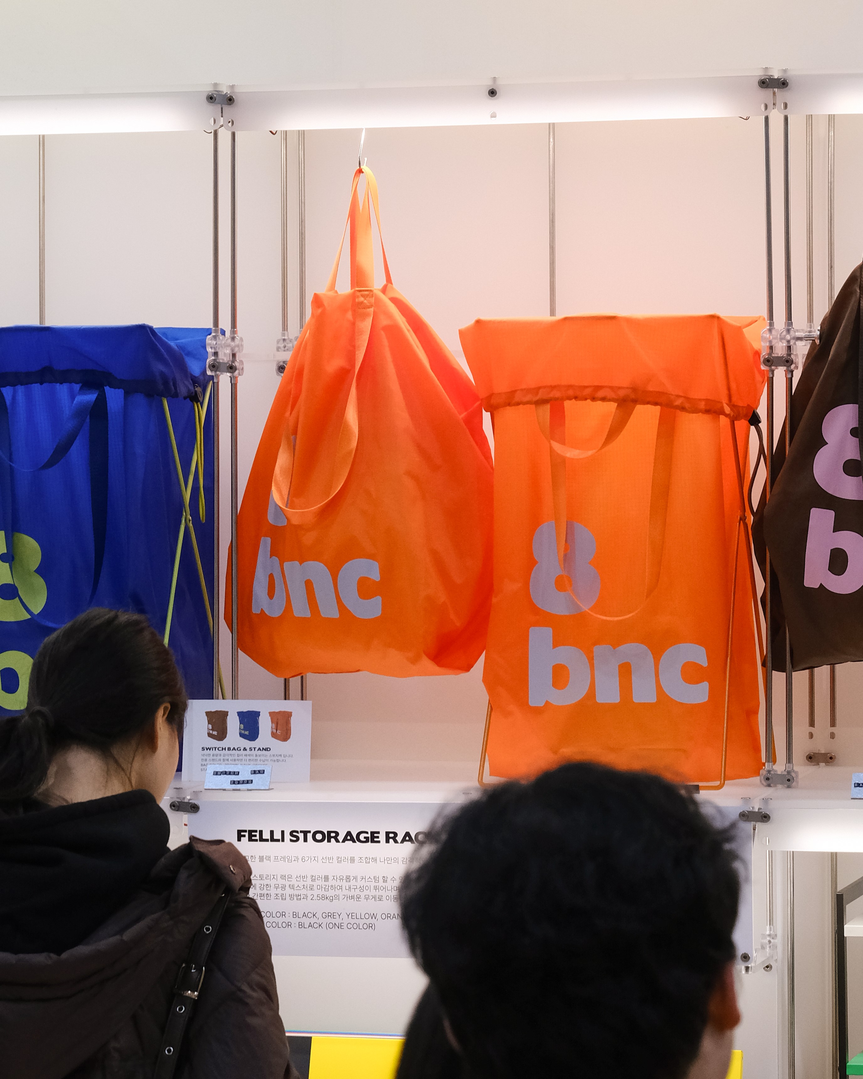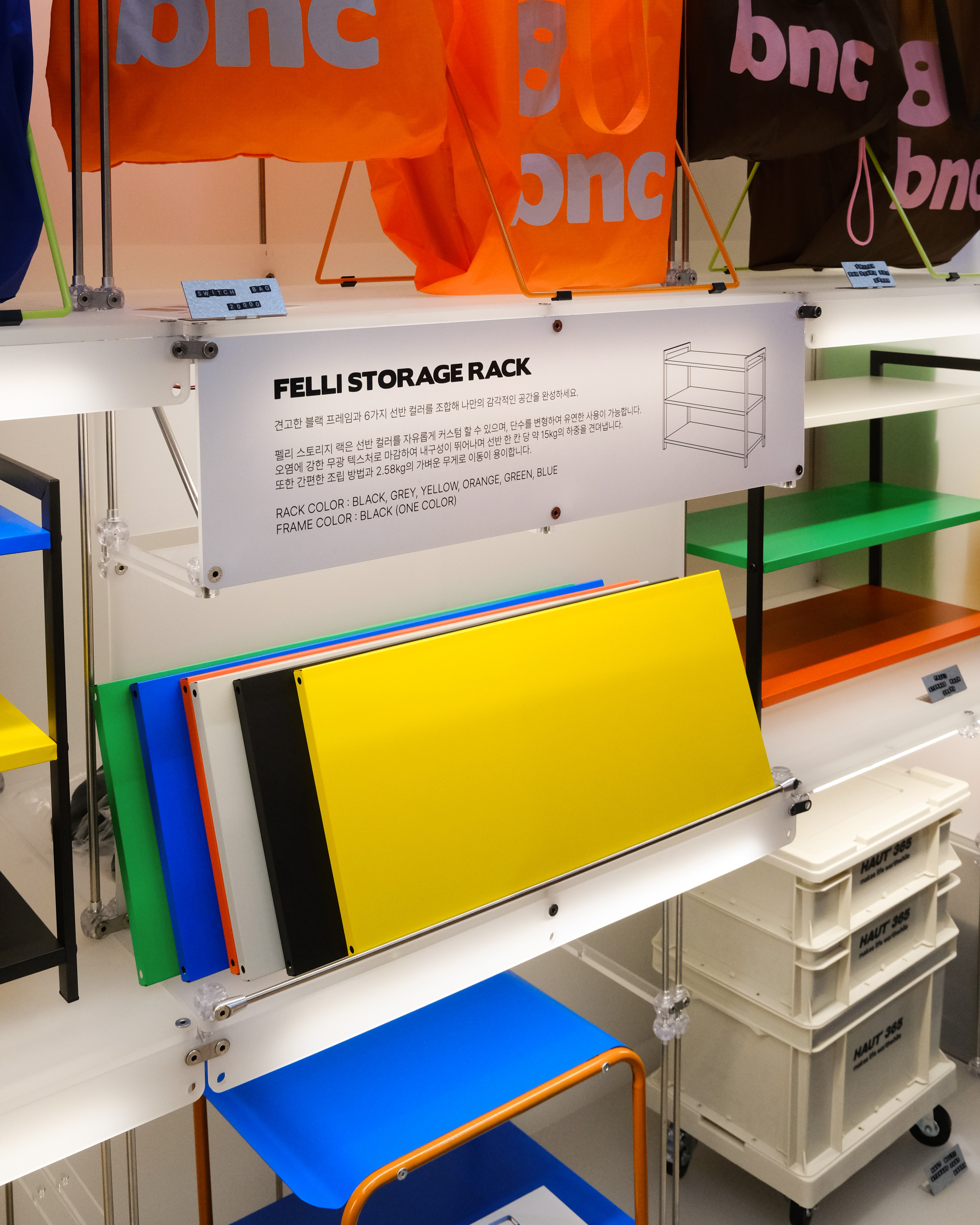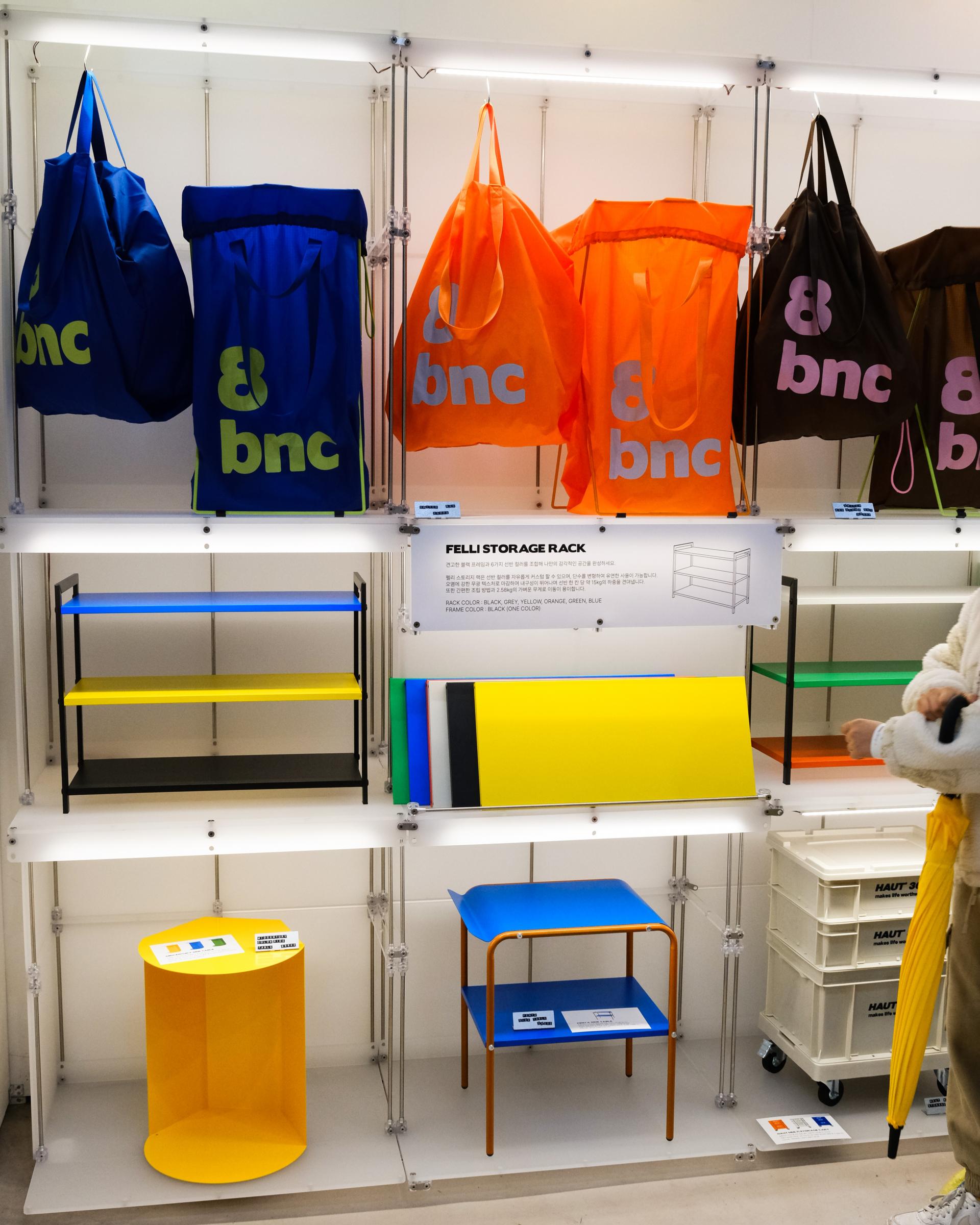 여러 카테고리의 제품을 하나의 브랜드 벽면으로 구성한 진열 시스템