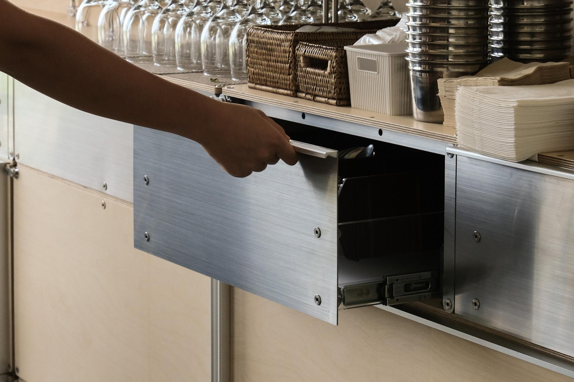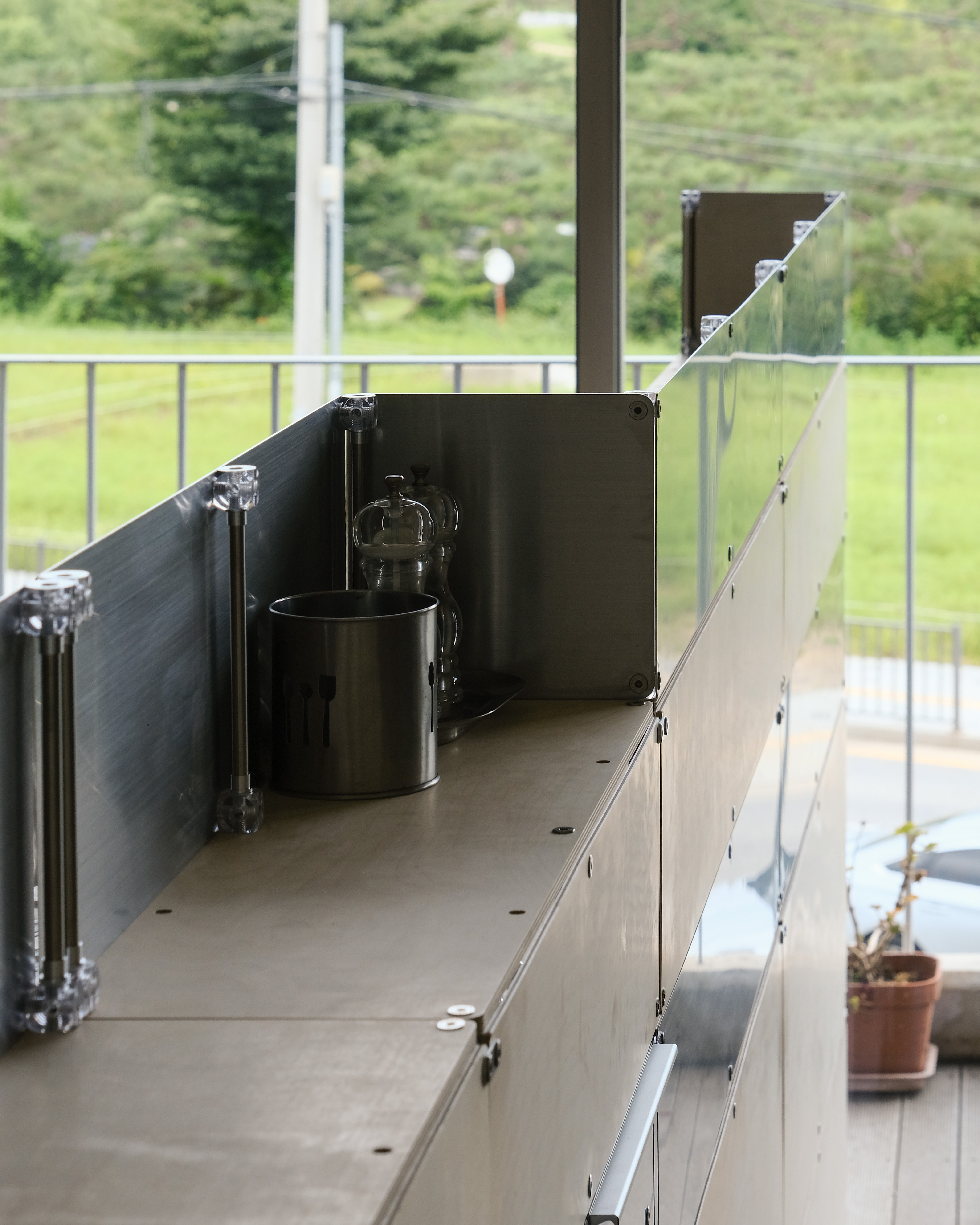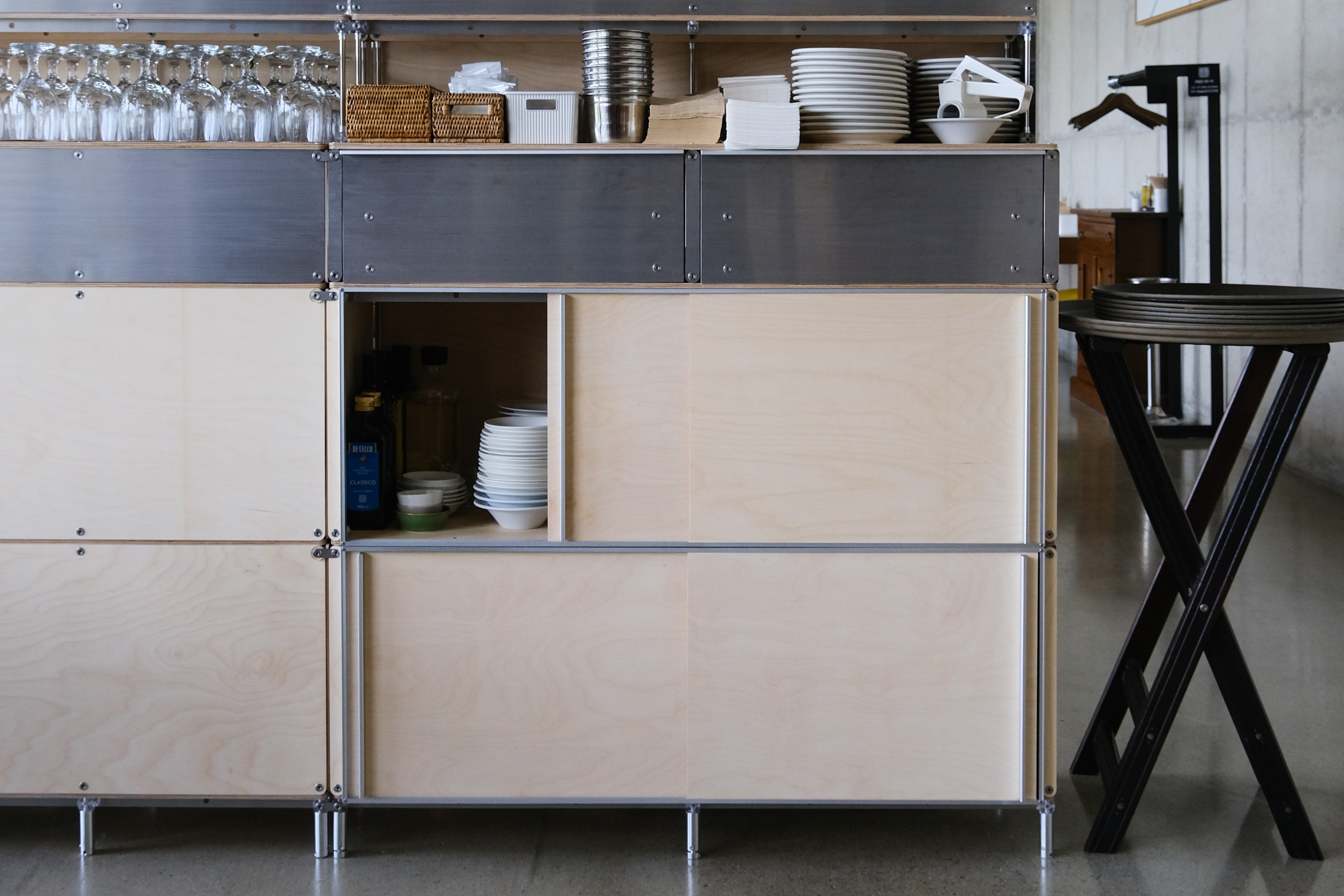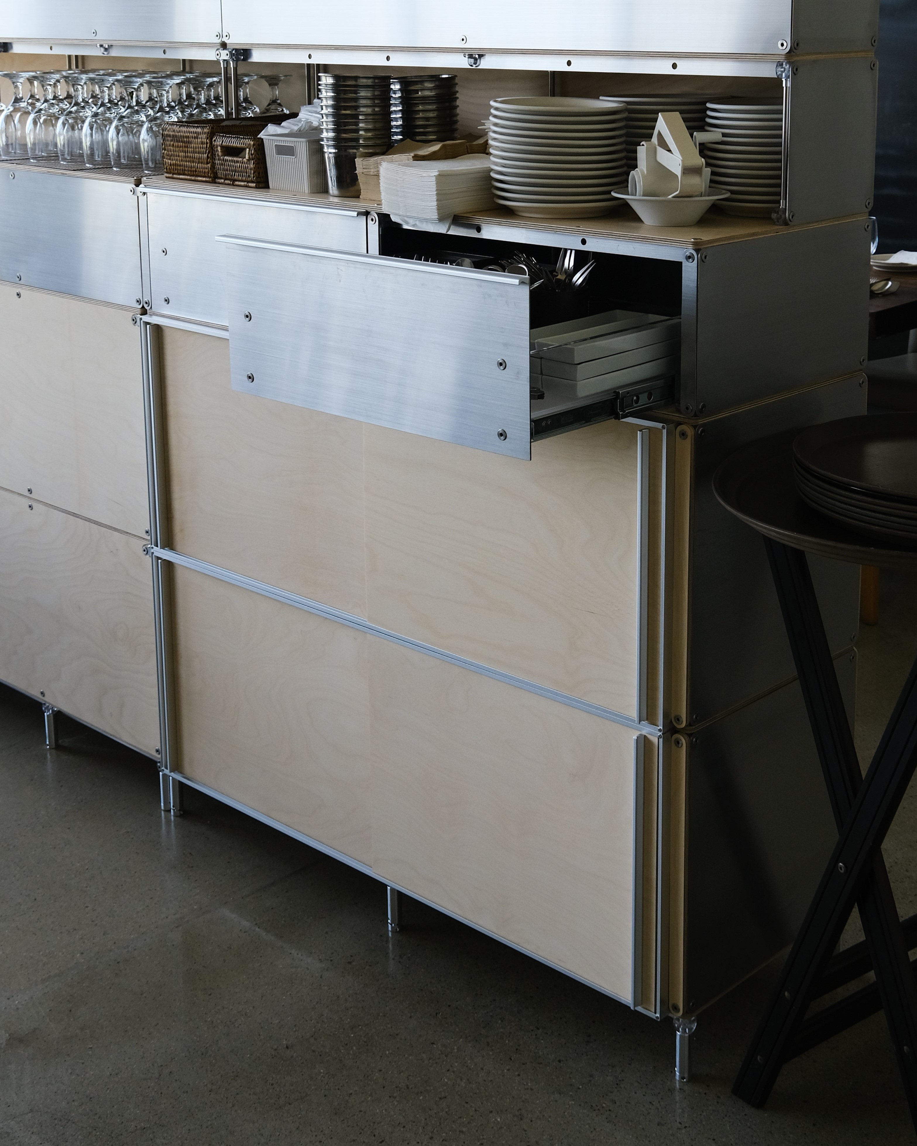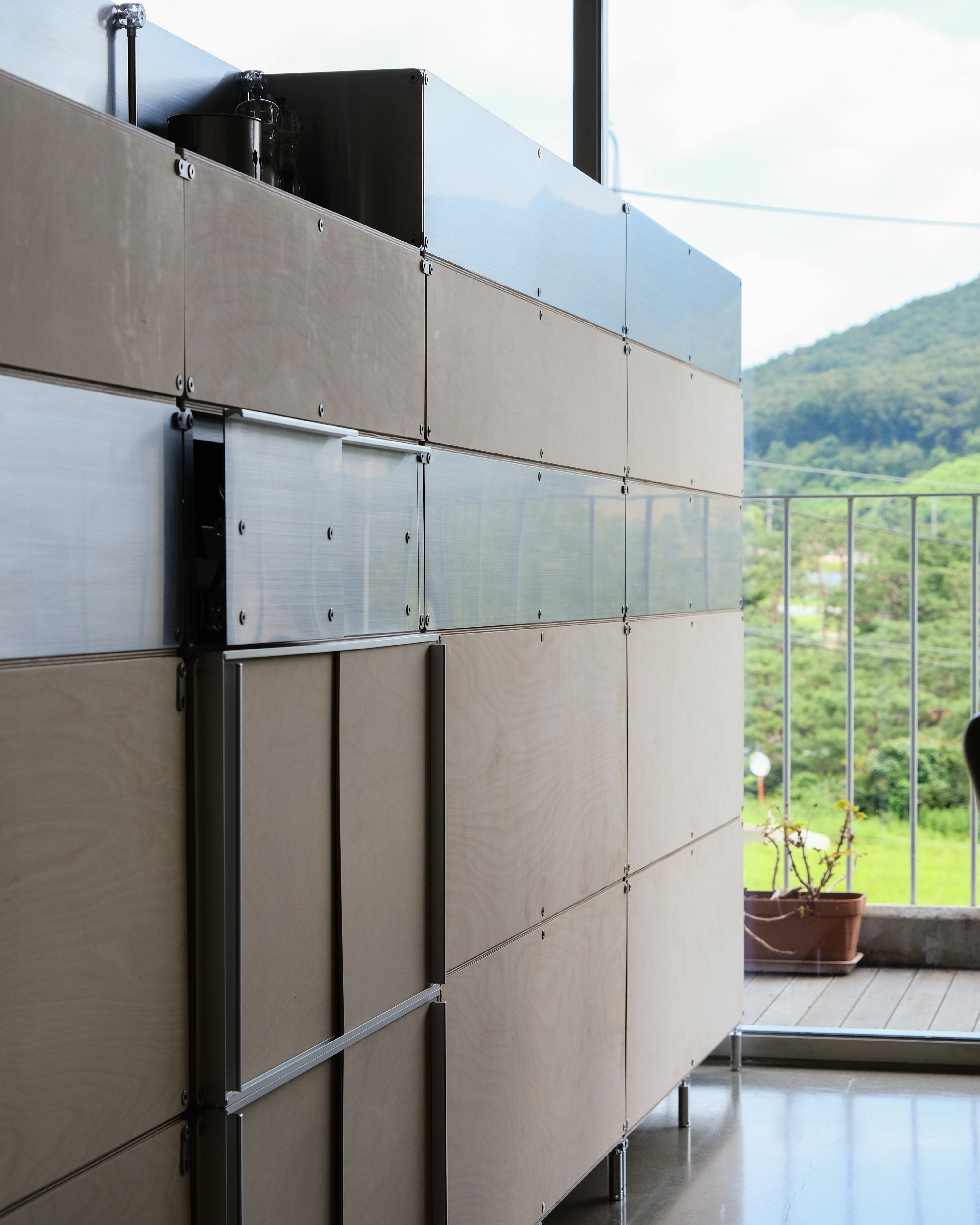 셀프바, 파티션, 수납 등 여러 기능을 수행하는 하나의 집기