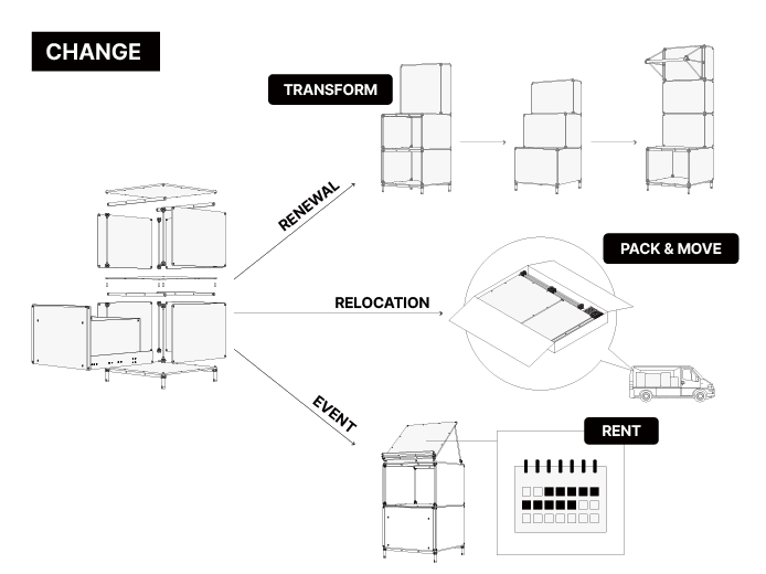 볼트&너트 체결 방식을 사용하는 STORE MODULAR SYSTEM™은 부품 단위로 전체 해체할 수 있으며, Flatpack 박스에 담아 편리하게 보관하거나 이동할 수 있습니다.