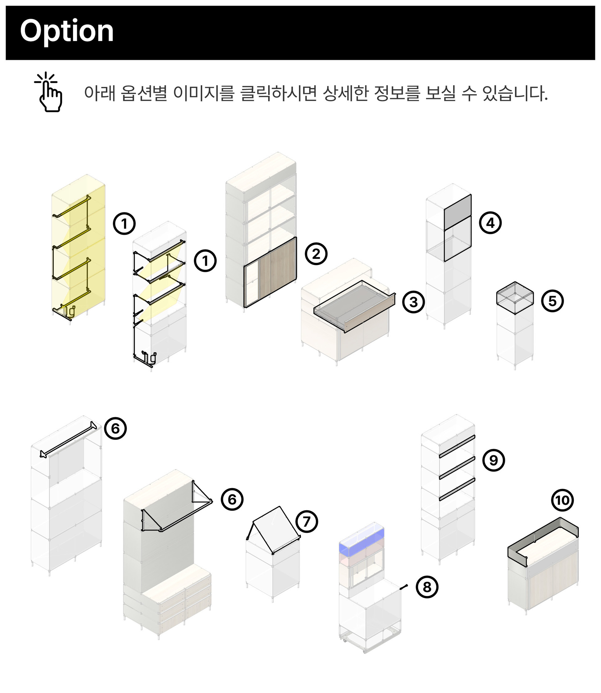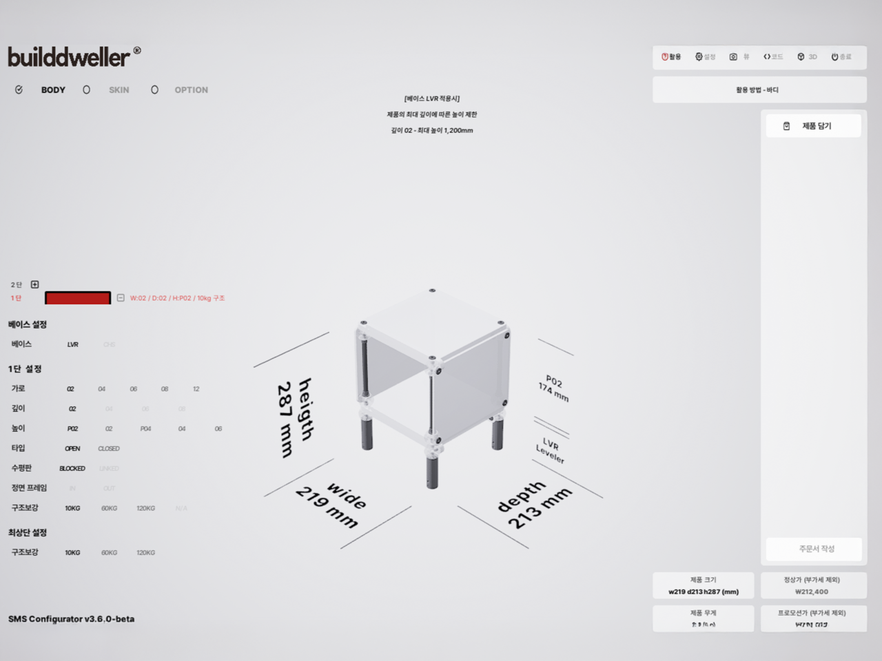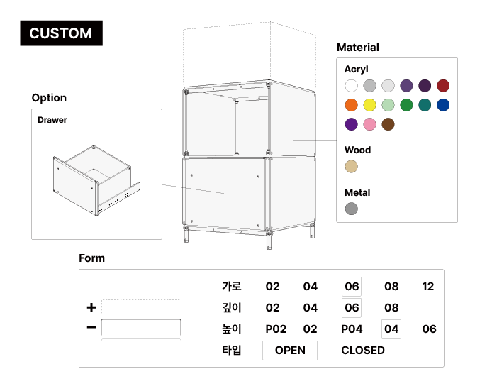 하부 구성(베이스), 제품의 크기, 단별 높이, 정면부의 타입(OPEN, CLOSED) 및 프레임 유무, 높이 단의 수평판 유무, 구조 보강 유무를 지정하여 다양한 형태로 디자인할 수 있습니다.