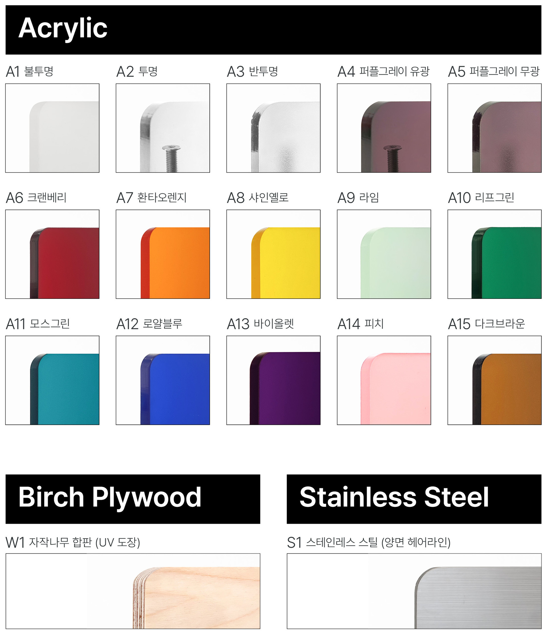 Plate(판재)의 재질은 아크릴 15가지 컬러, 자작나무 합판, 스테인리스 스틸 총 17가지 중에서 선택할 수 있습니다.