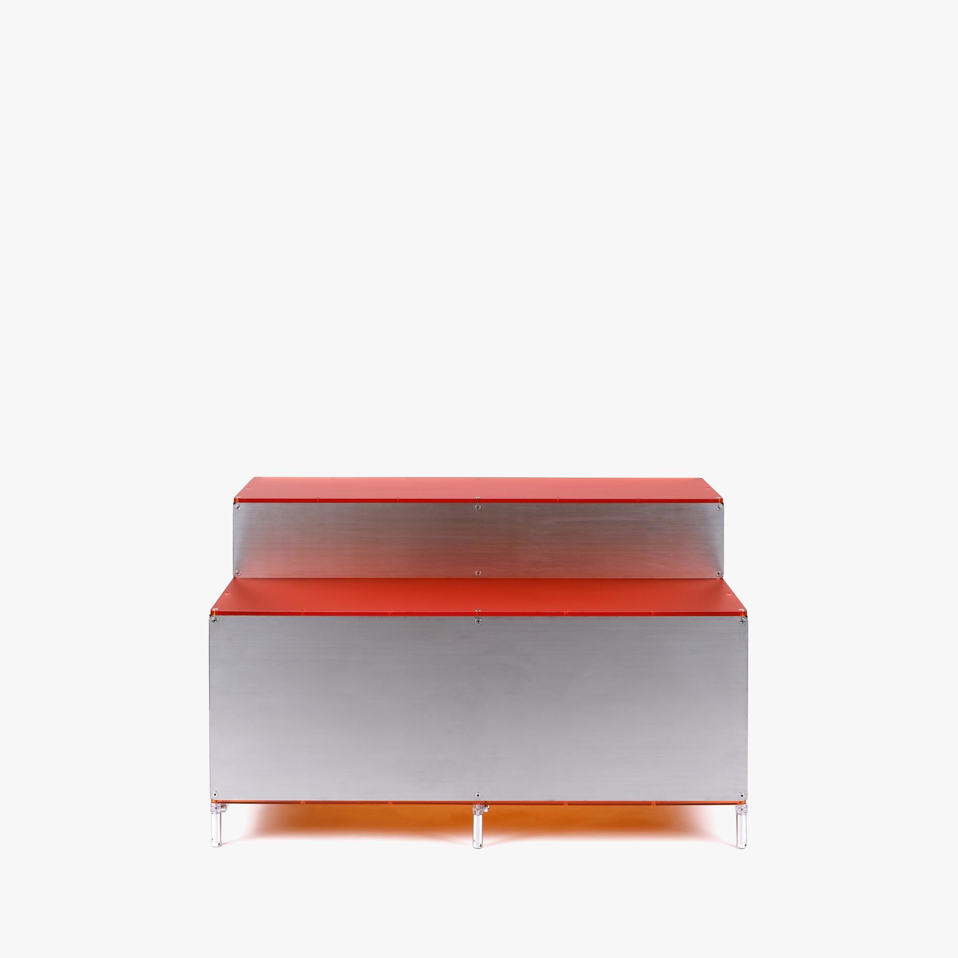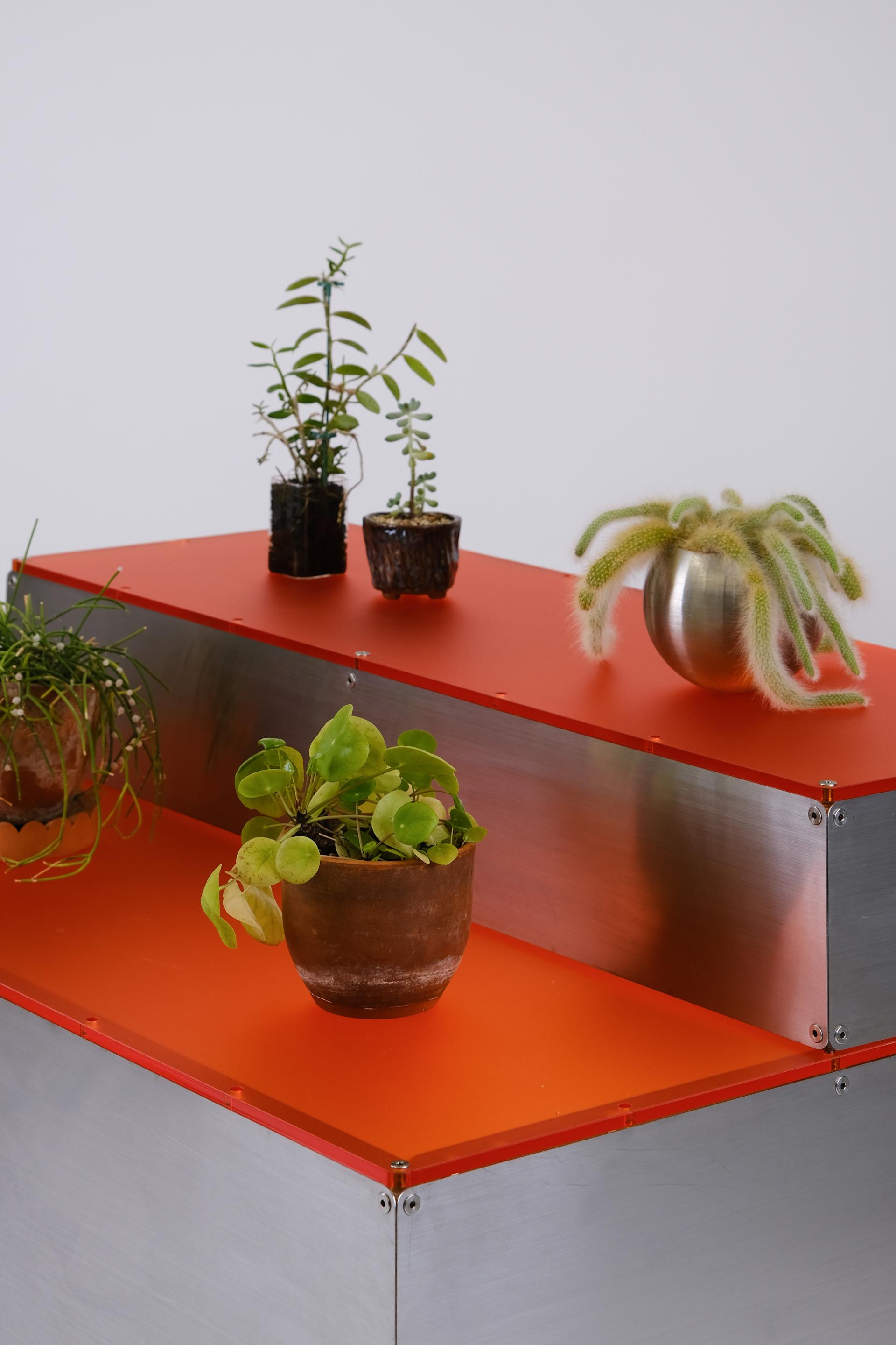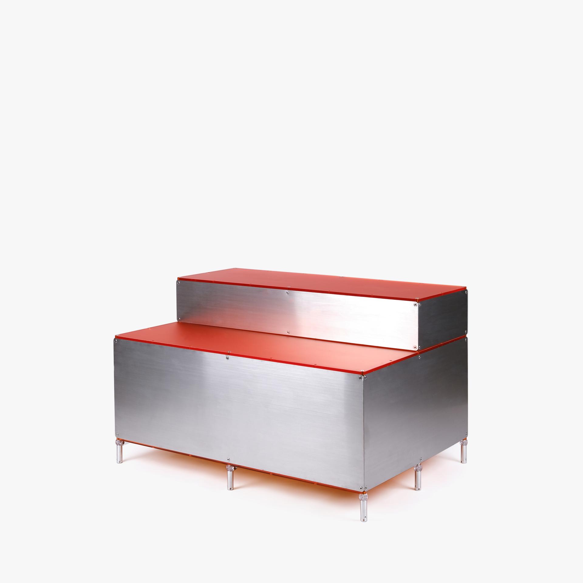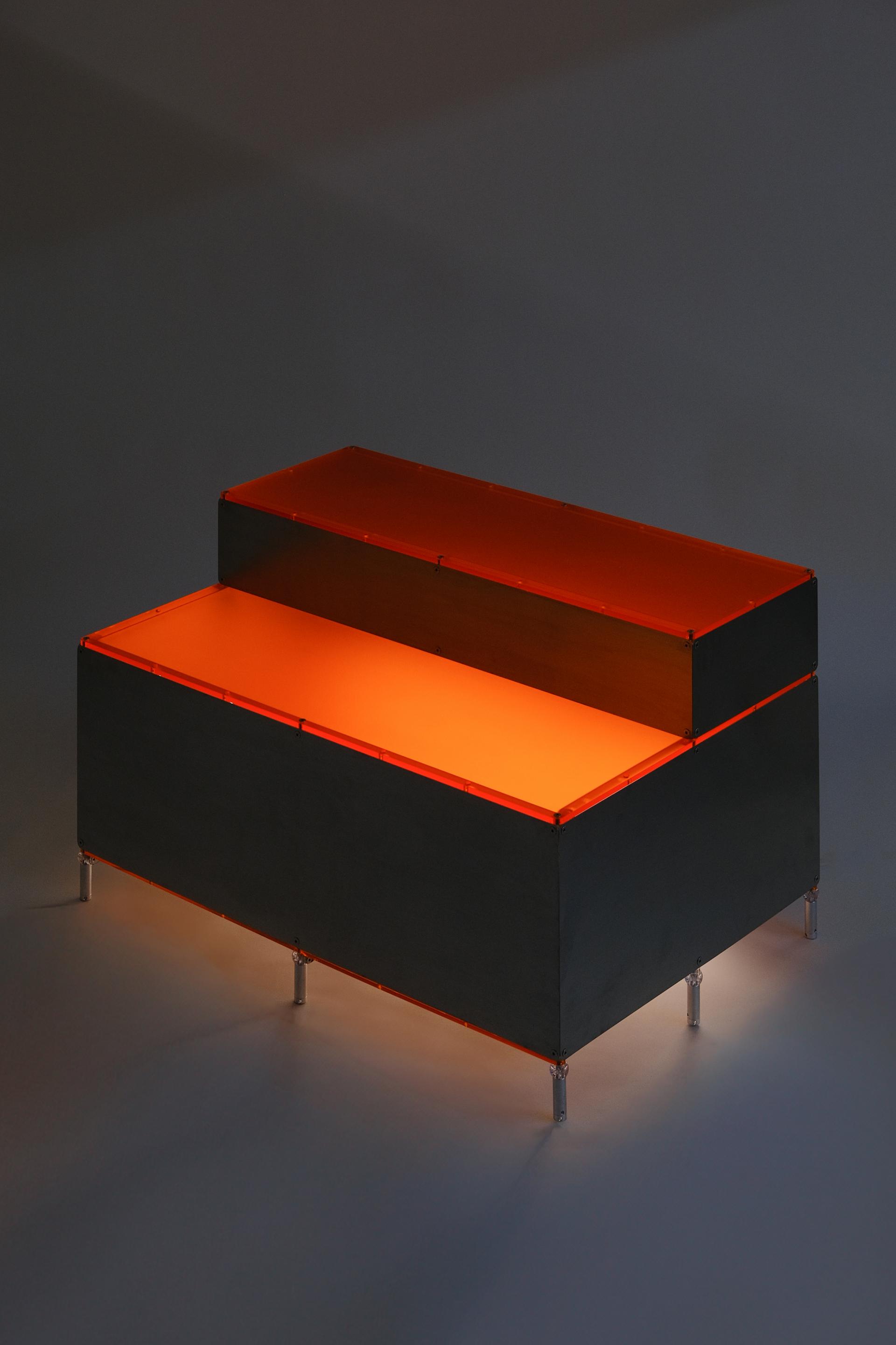 단차에 의해 진열품 각각을 효과적으로 보여줄 수 있는 스텝형 진열대입니다. 운동화, 식물, LP 등 상품군에 제한 없이 전시가 가능합니다. 스테인리스 스틸 마감에 상판에는 환타오렌지 아크릴이 적용되었습니다. 진열대 내부에는 조명 옵션이 적용되어 은은한 오렌지 빛으로 진열품을 강조합니다.