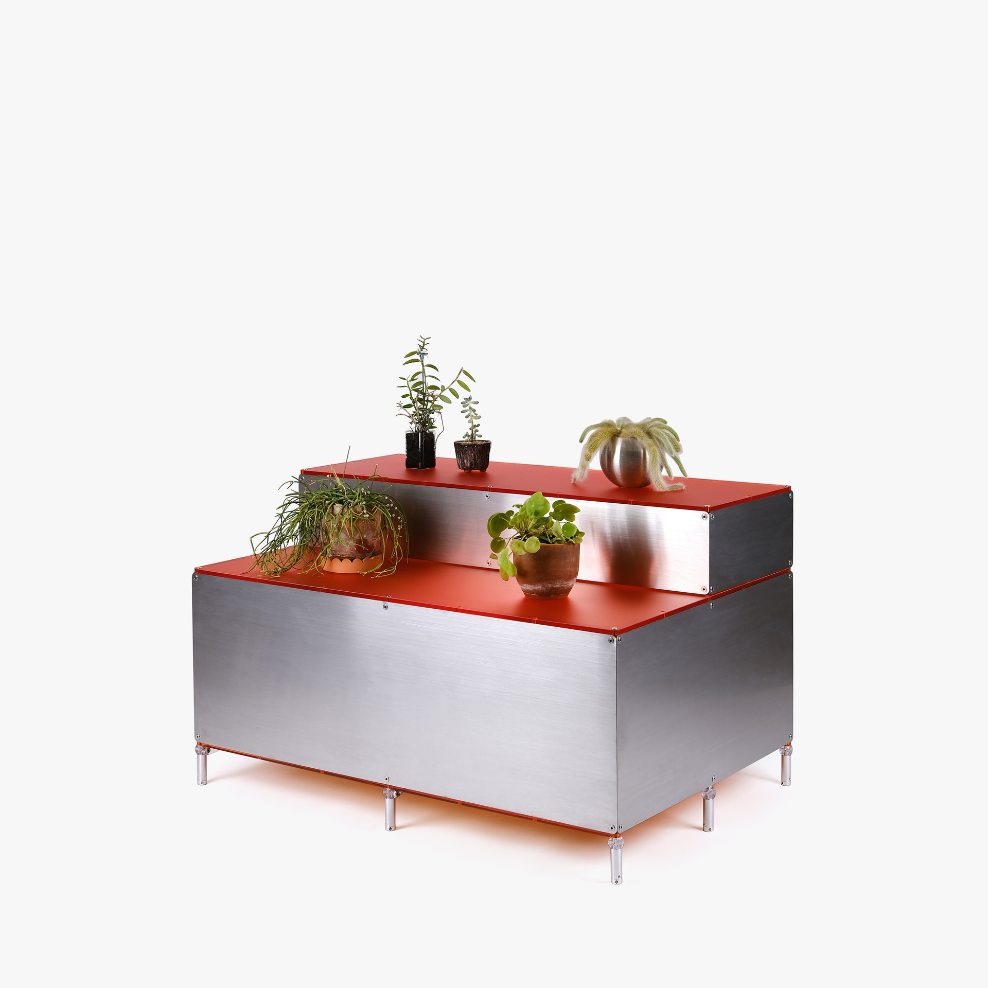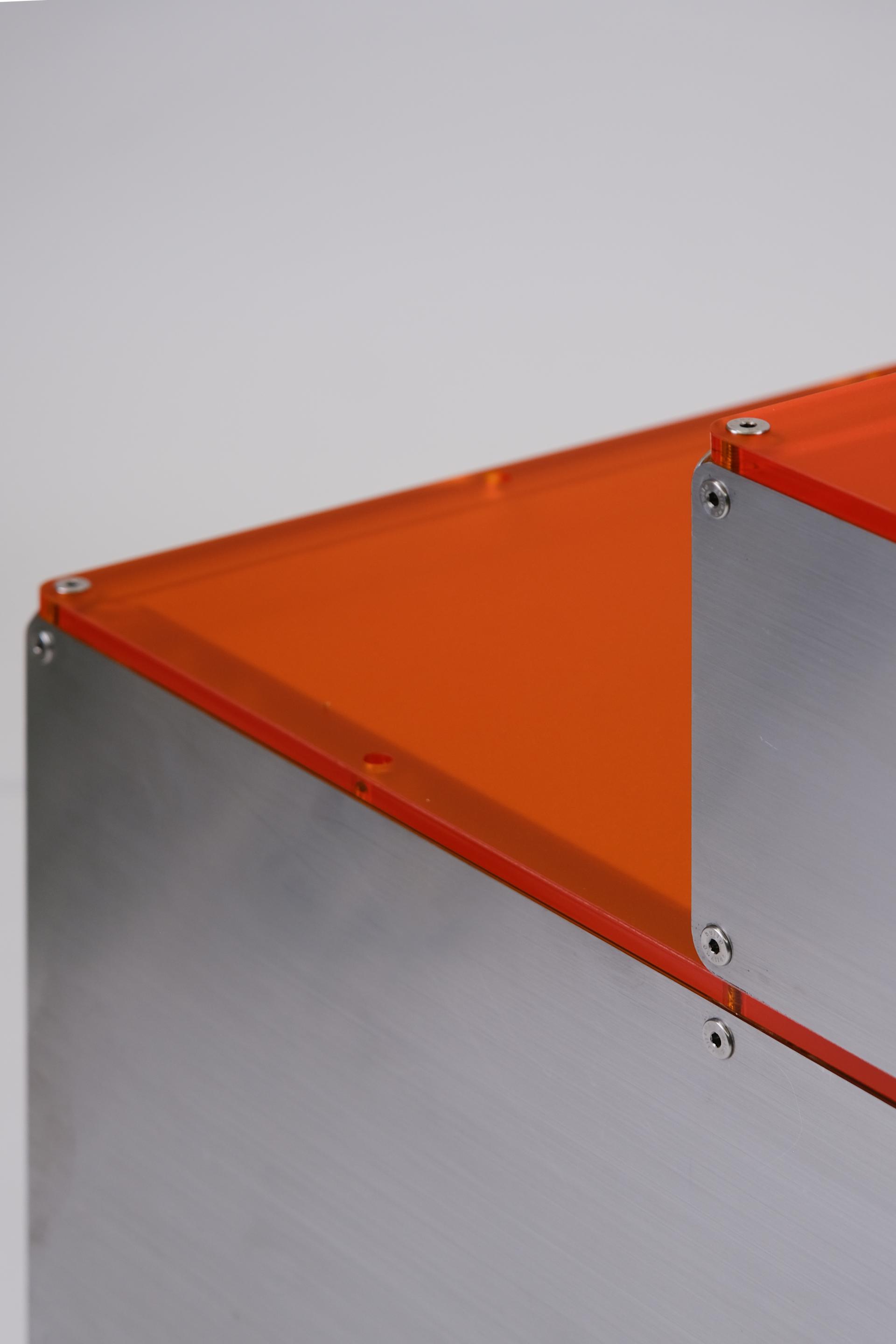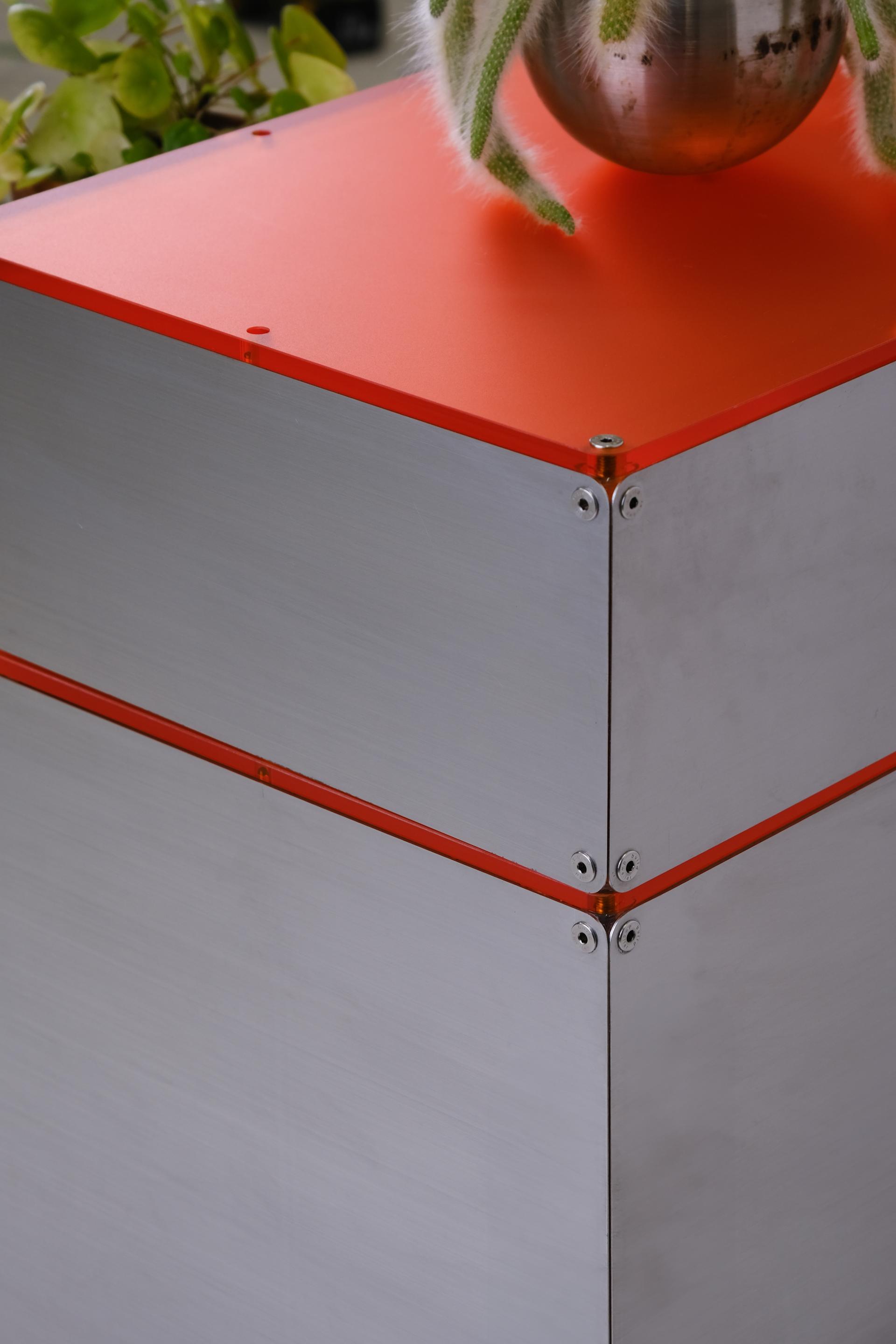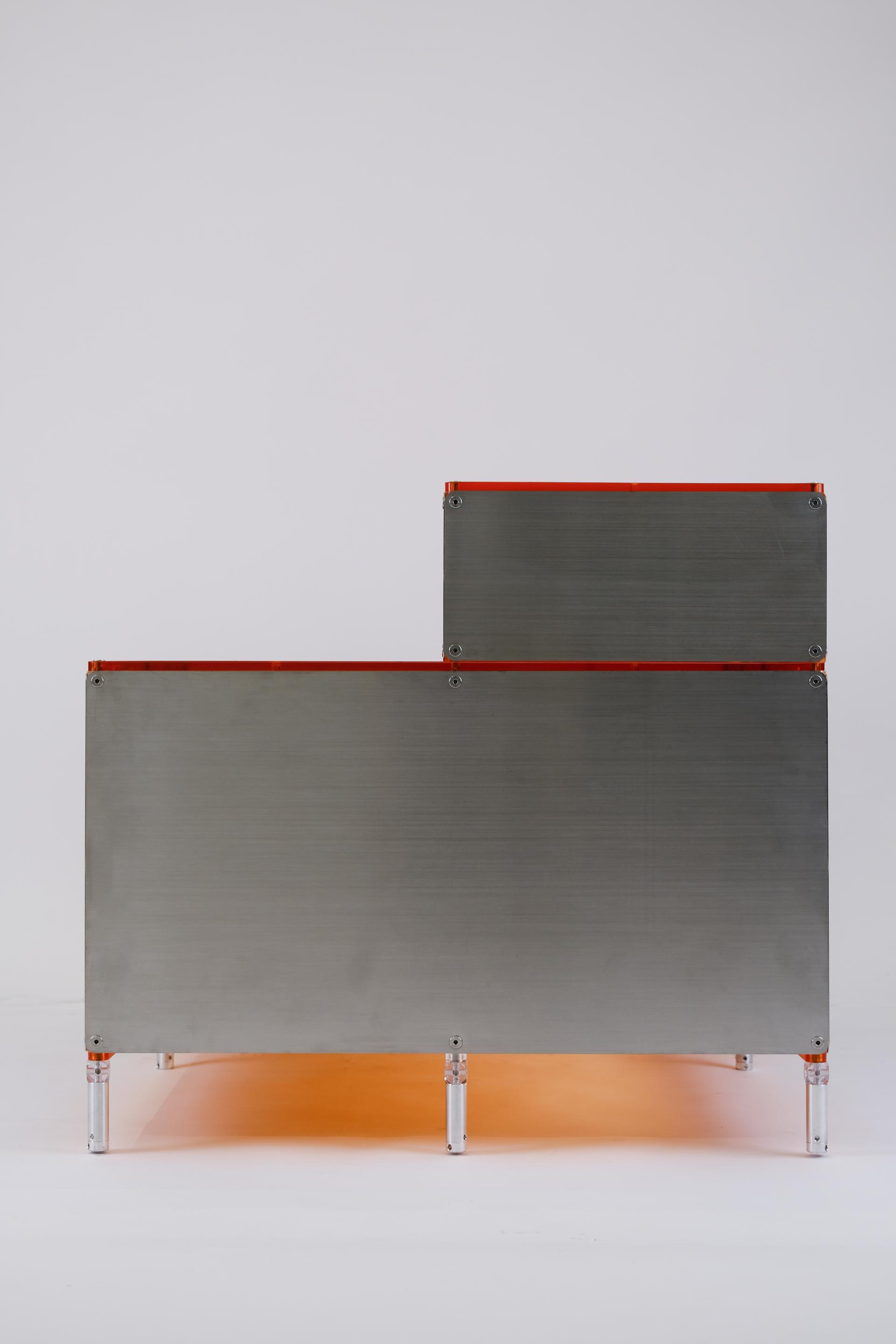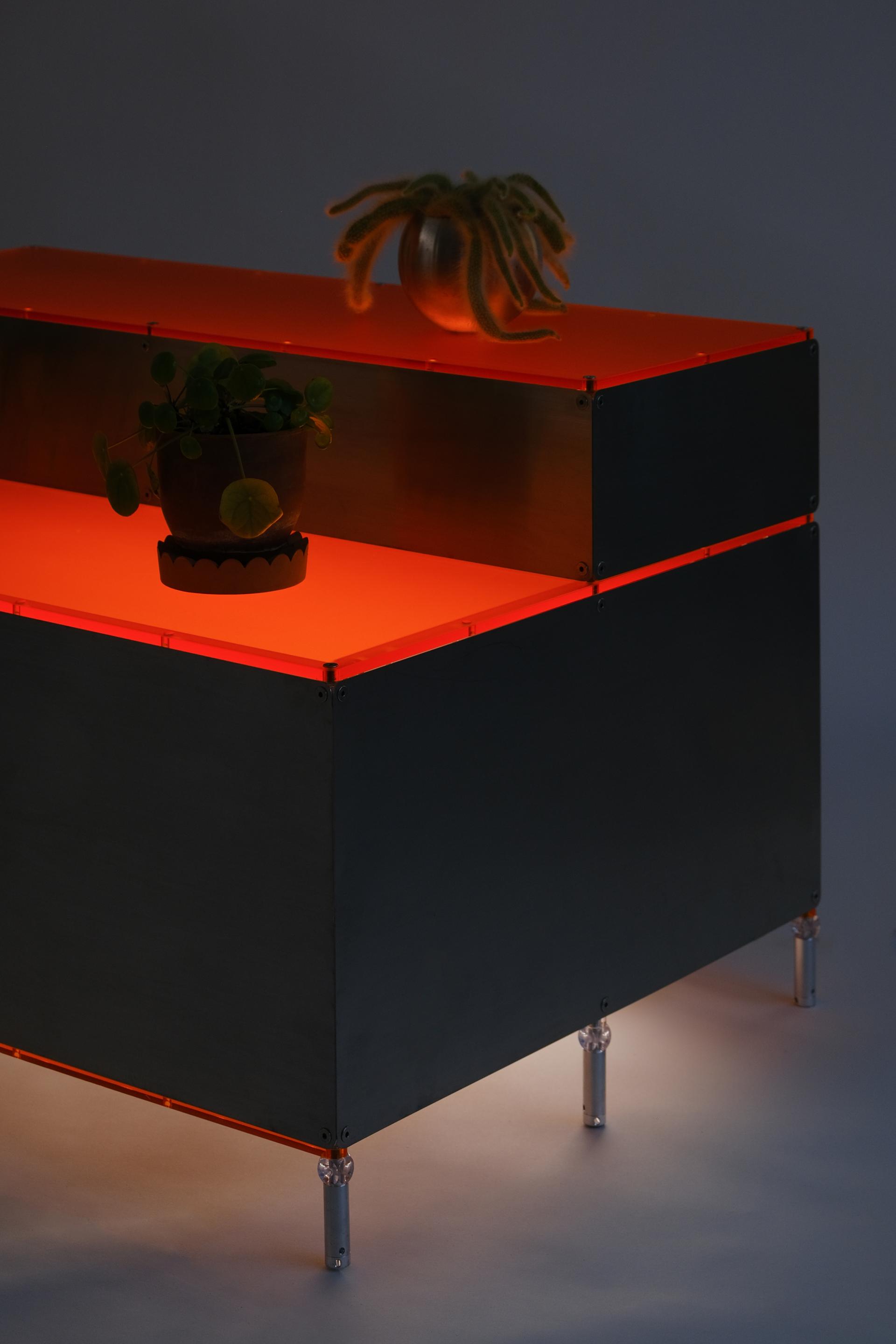 단차에 의해 진열품 각각을 효과적으로 보여줄 수 있는 스텝형 진열대입니다. 운동화, 식물, LP 등 상품군에 제한 없이 전시가 가능합니다. 스테인리스 스틸 마감에 상판에는 환타오렌지 아크릴이 적용되었습니다. 진열대 내부에는 조명 옵션이 적용되어 은은한 오렌지 빛으로 진열품을 강조합니다.