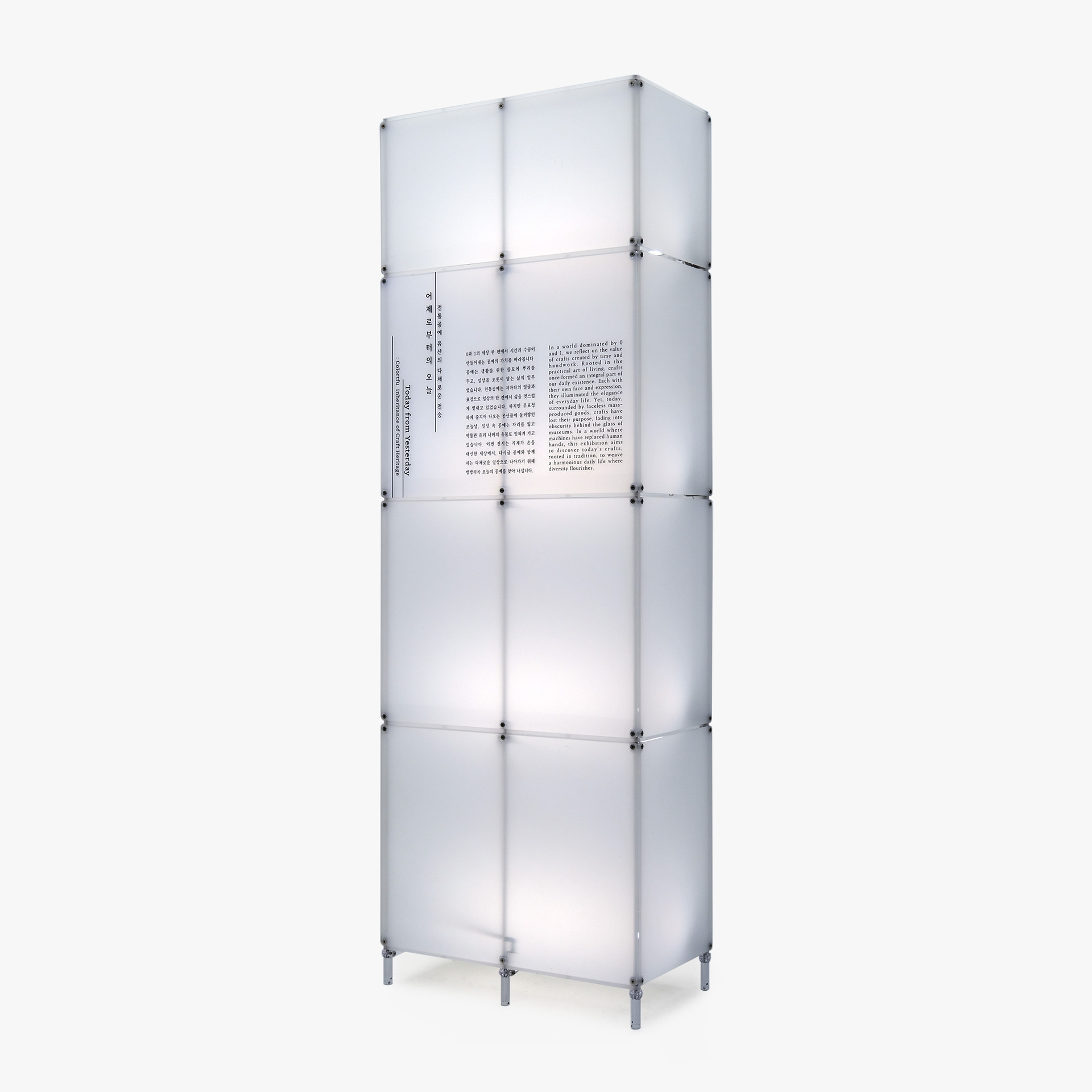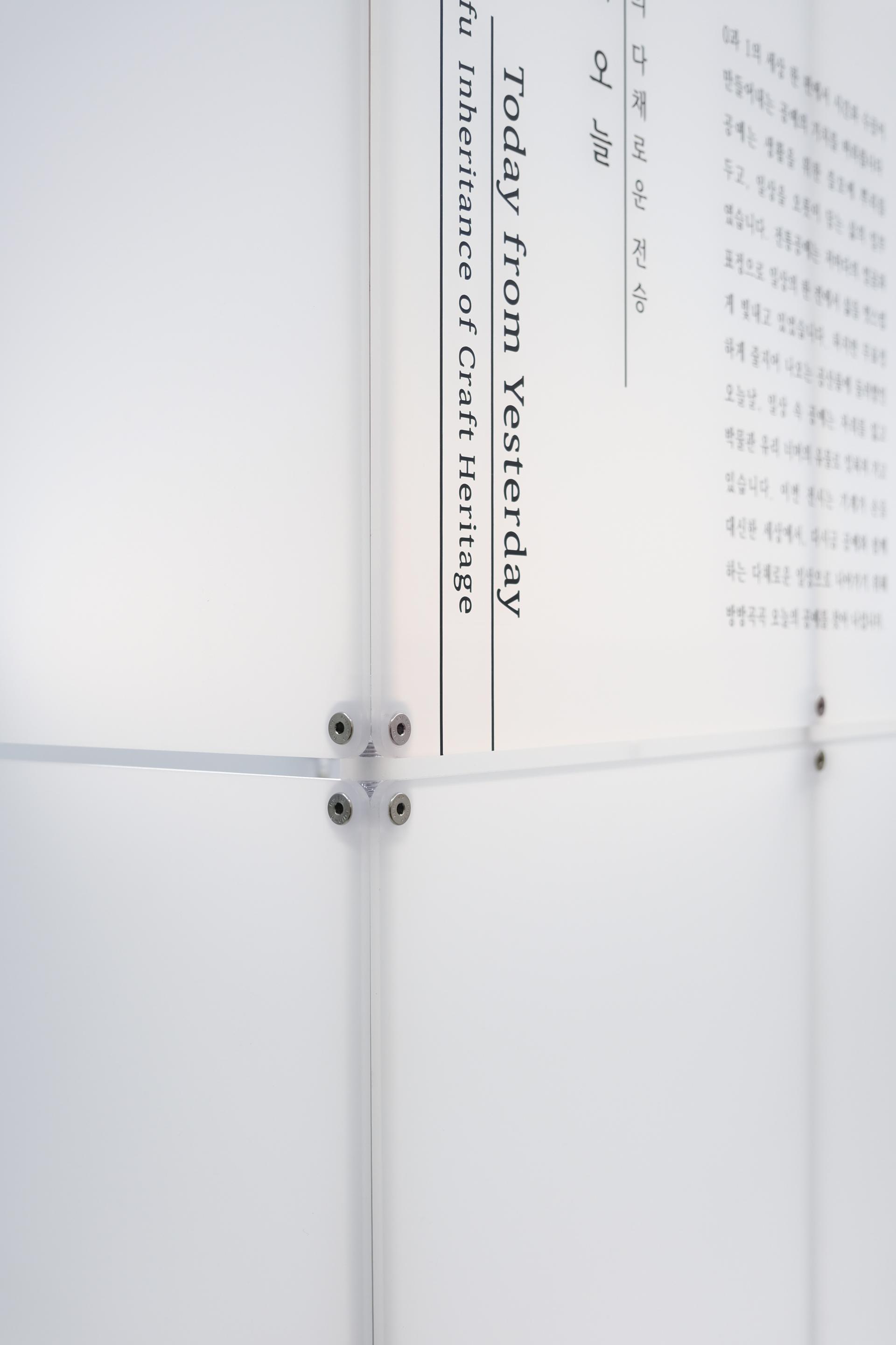 The Monuments 중앙 전시실에 들어선 관람객은 전통공예의 고귀함을 직관적으로 느낄 수 있도록 높은 단 위에 전시된 전통공예품을 우러러보게 됩니다. 그 곁에는 호위무사를 닮은 낮은 전시대가 공예품의 소재와 도구를 투명하게 담아내 관람객의 몰입을 한층 고조시킵니다. 글과 이미지가 담긴 뒤편의 벽에는 창이 뚫려, 전통공예를 소개하면서 동시에 오늘날 우리의 일상에 갖는 새로운 가능성을 엿볼 수 있게 합니다. | ![]() |