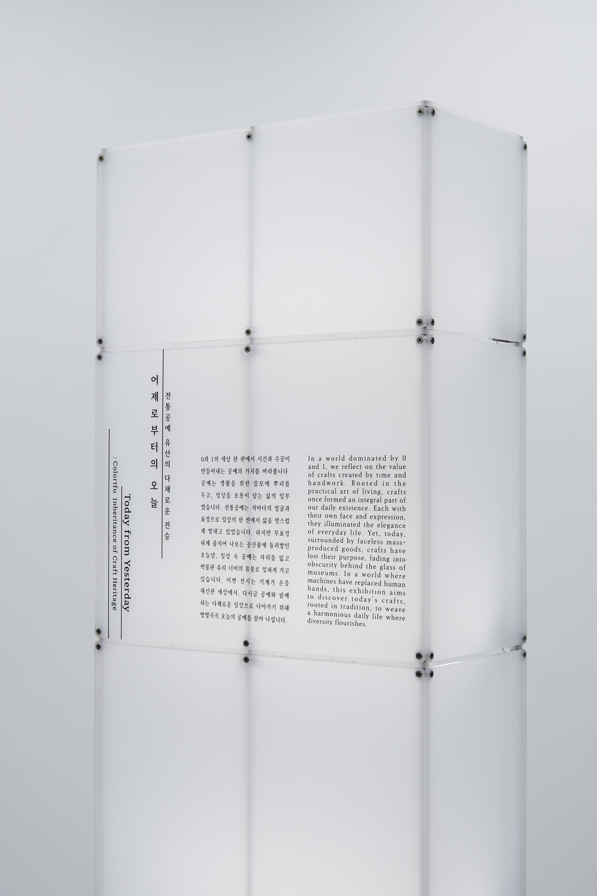 높이 솟아 있는 전통의 숭고함과 다양한 높이로 이어지는 전승의 다채로움이 등을 맞대고 마주합니다. 단 하나의 계승이 아닌 다채로운 전승으로 전통 공예를 이어가기 위해 전통 공예의 장엄함과 그 맥을 이어가는 다채로운 현대 공예의 접점을 담아냅니다. |