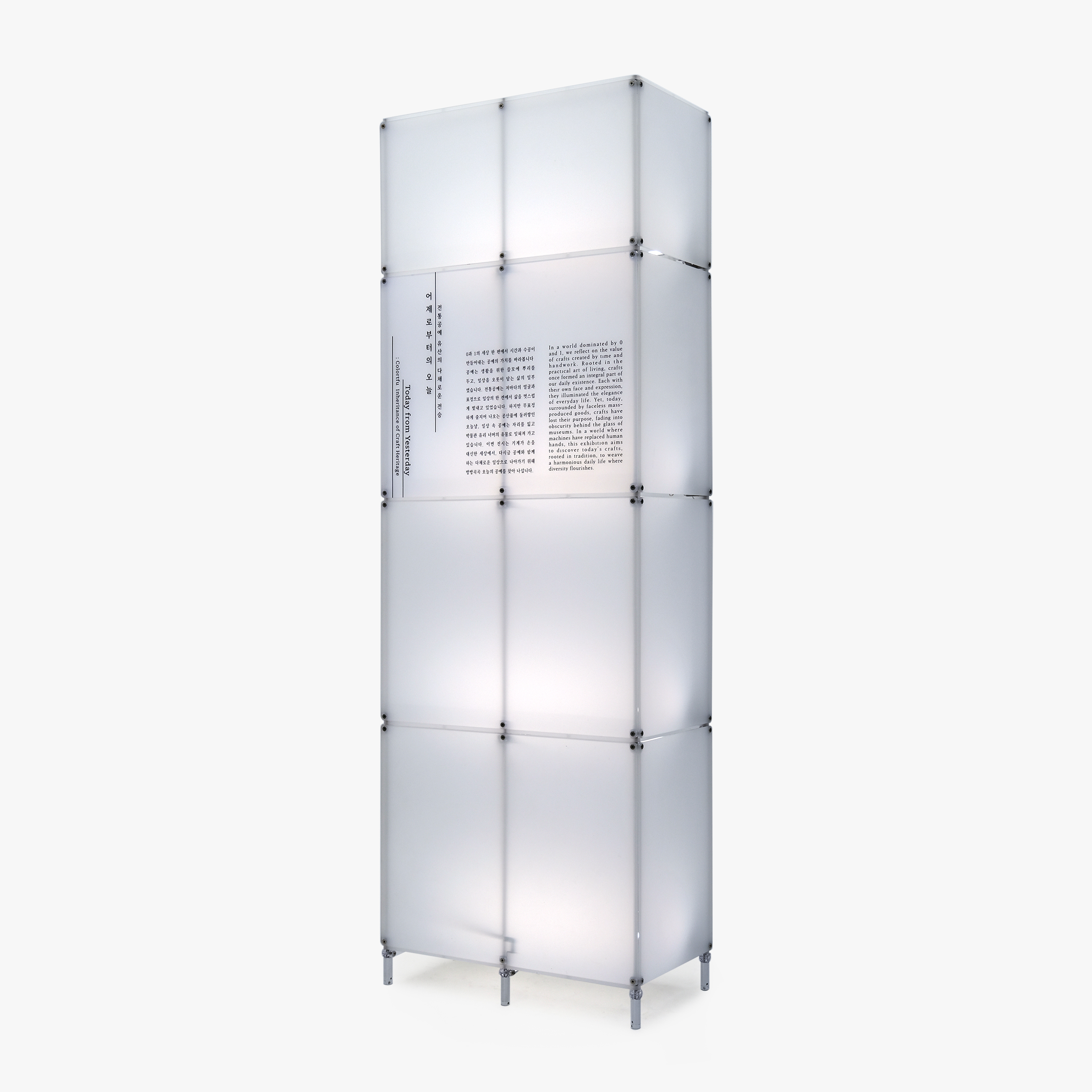 전시품을 보조하는 시각 자료는 관람객이 작품을 더 깊이 이해하고 몰입할 수 있도록 도와줍니다. 경사형 전시대는 전시를 위한 글이나 이미지를 올려 놓을 수 있는 경사형 판재 옵션 ‘슬로프(Slope)’가 적용되었고 하부에는 조명 옵션이 적용되었습니다. |