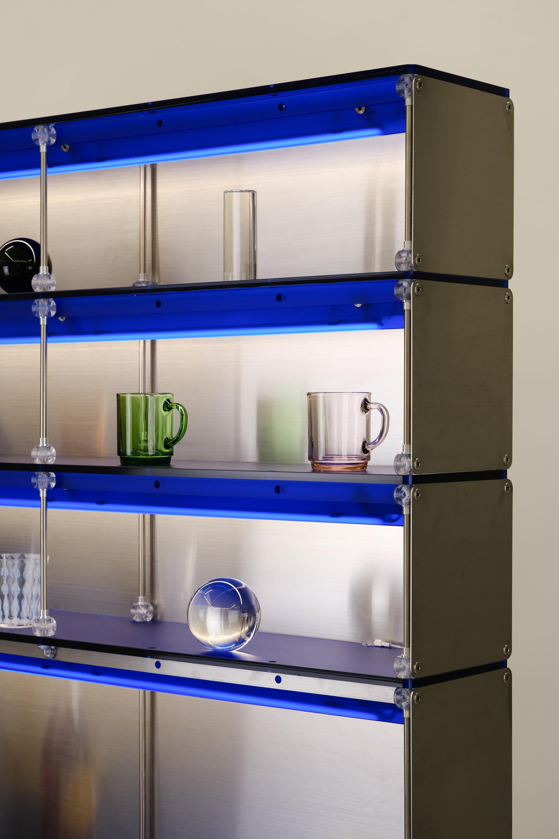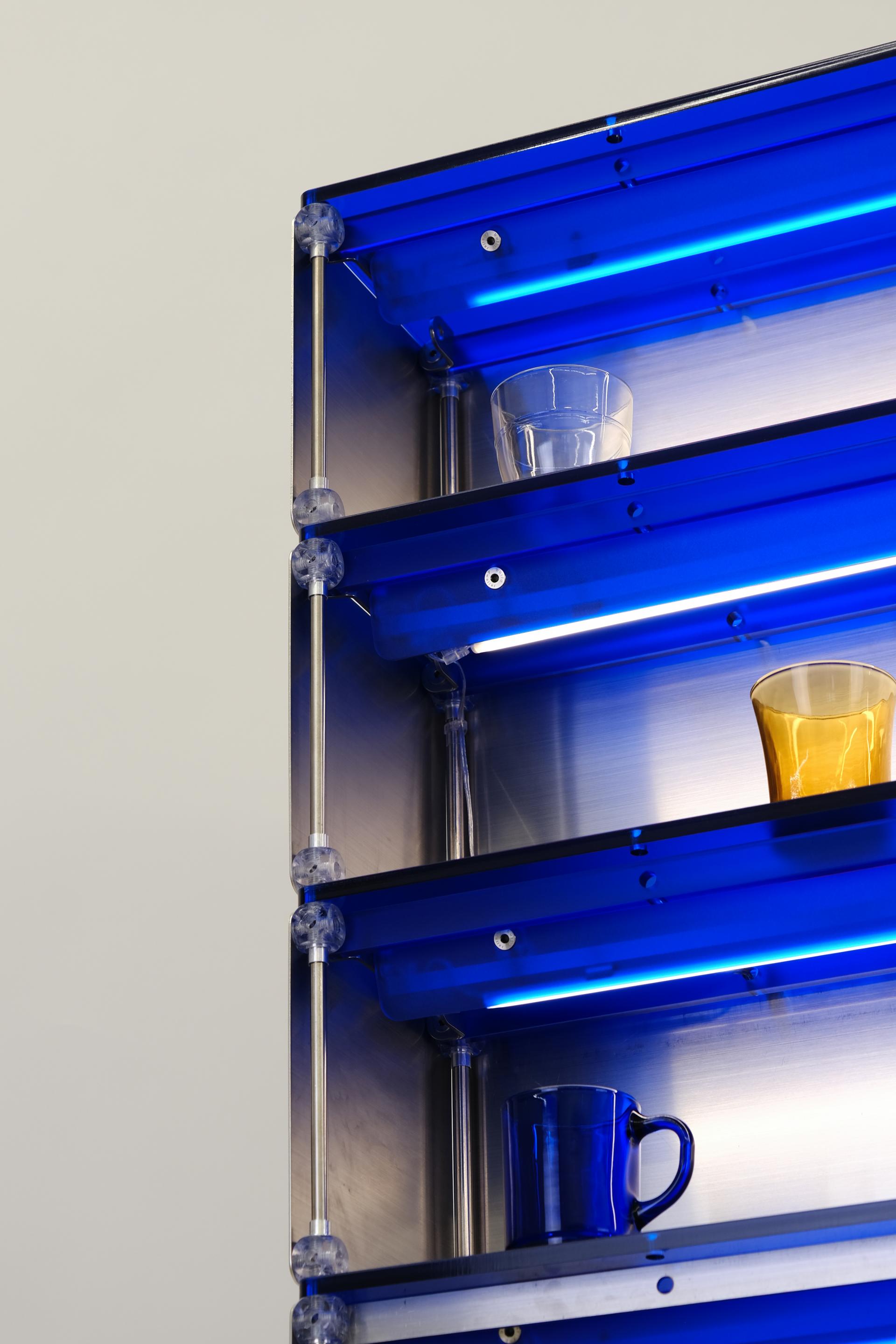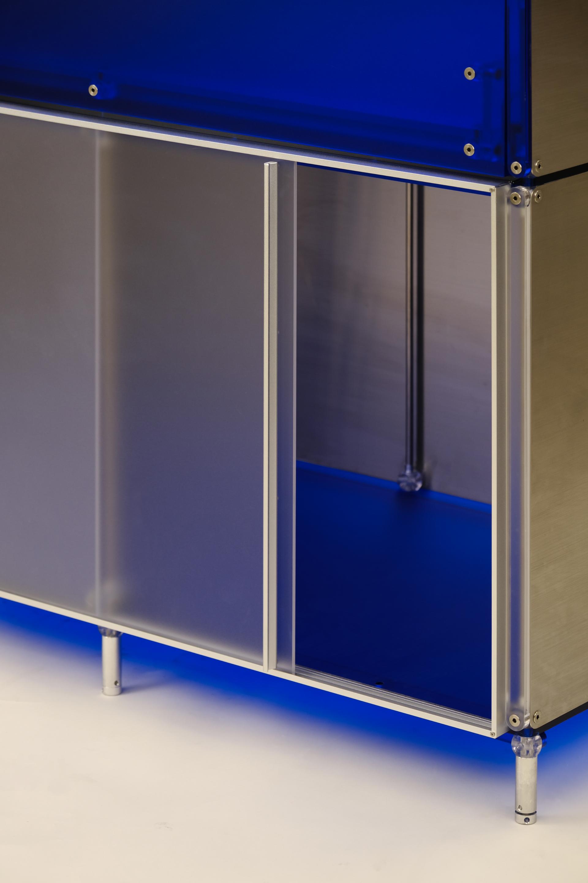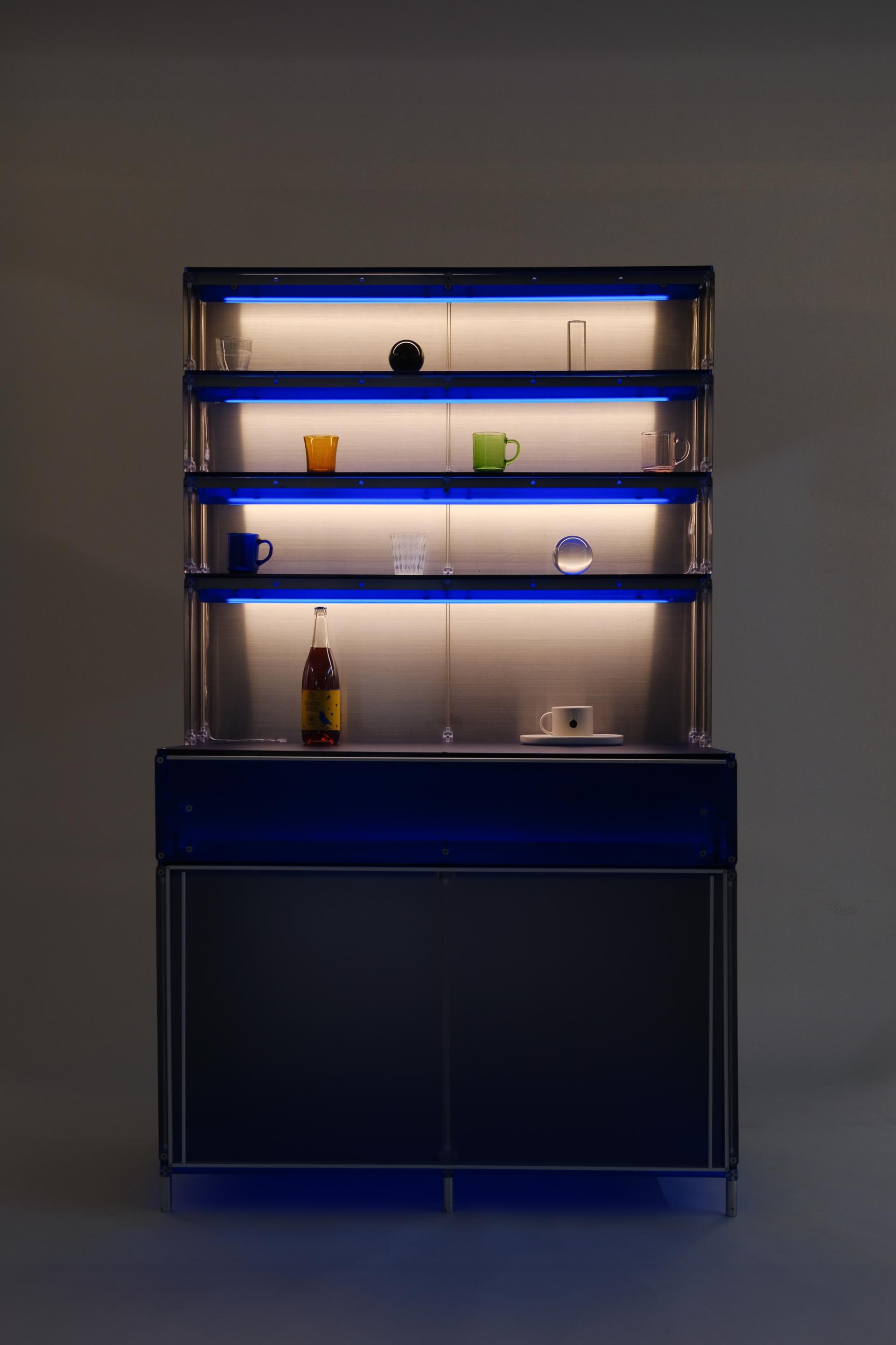 F&B 상업공간에서 키친웨어(도기, 식기, 주방용품 등)를 효과적으로 진열할 수 있는 형태의 집기입니다. 스테인리스 스틸과 로얄 블루 컬러의 아크릴로 구성되어 있습니다. 상부에는 각 단별로 조명이 적용되어 있으며 깊이 206mm의 오픈 선반에 작은 컵이나 도기를 효과적으로 진열할 수 있습니다. 902mm 높이의 중간 선반은 서비스 테이블로 활용될 정도의 충분한 면적을 제공합니다. 하부에는 식기류를 효과적으로 수납할 수 있는 서랍과 큰 부피의 상품이나 재고를 보관할 수 있는 슬라이딩 도어가 적용된 보관함으로 구성되어 있습니다.