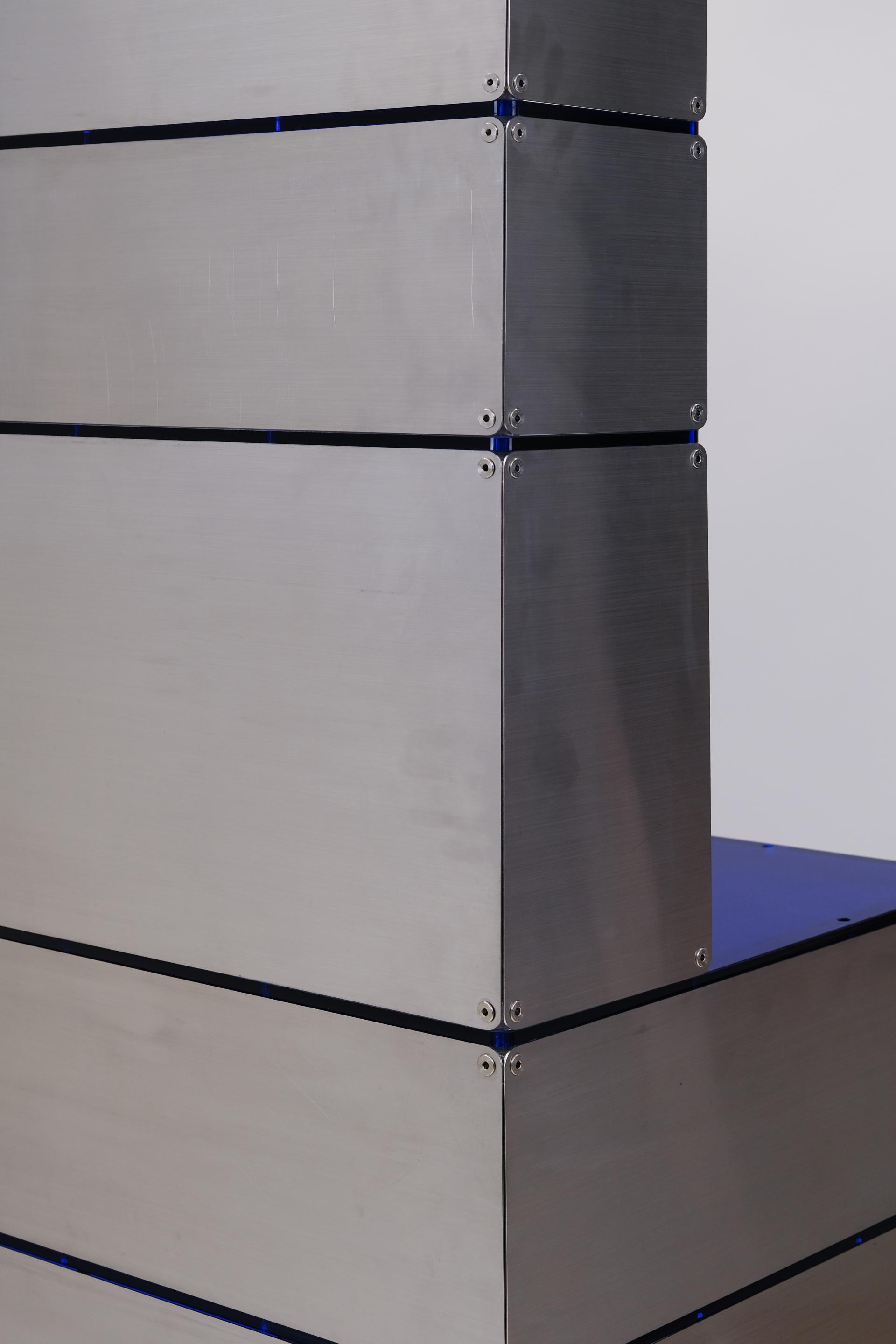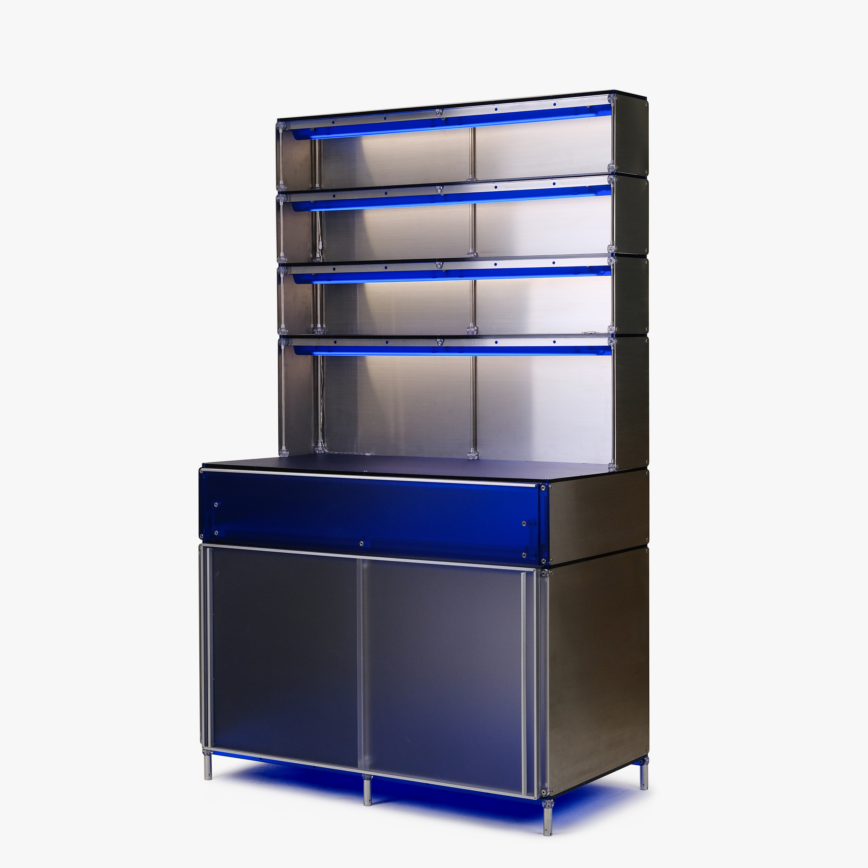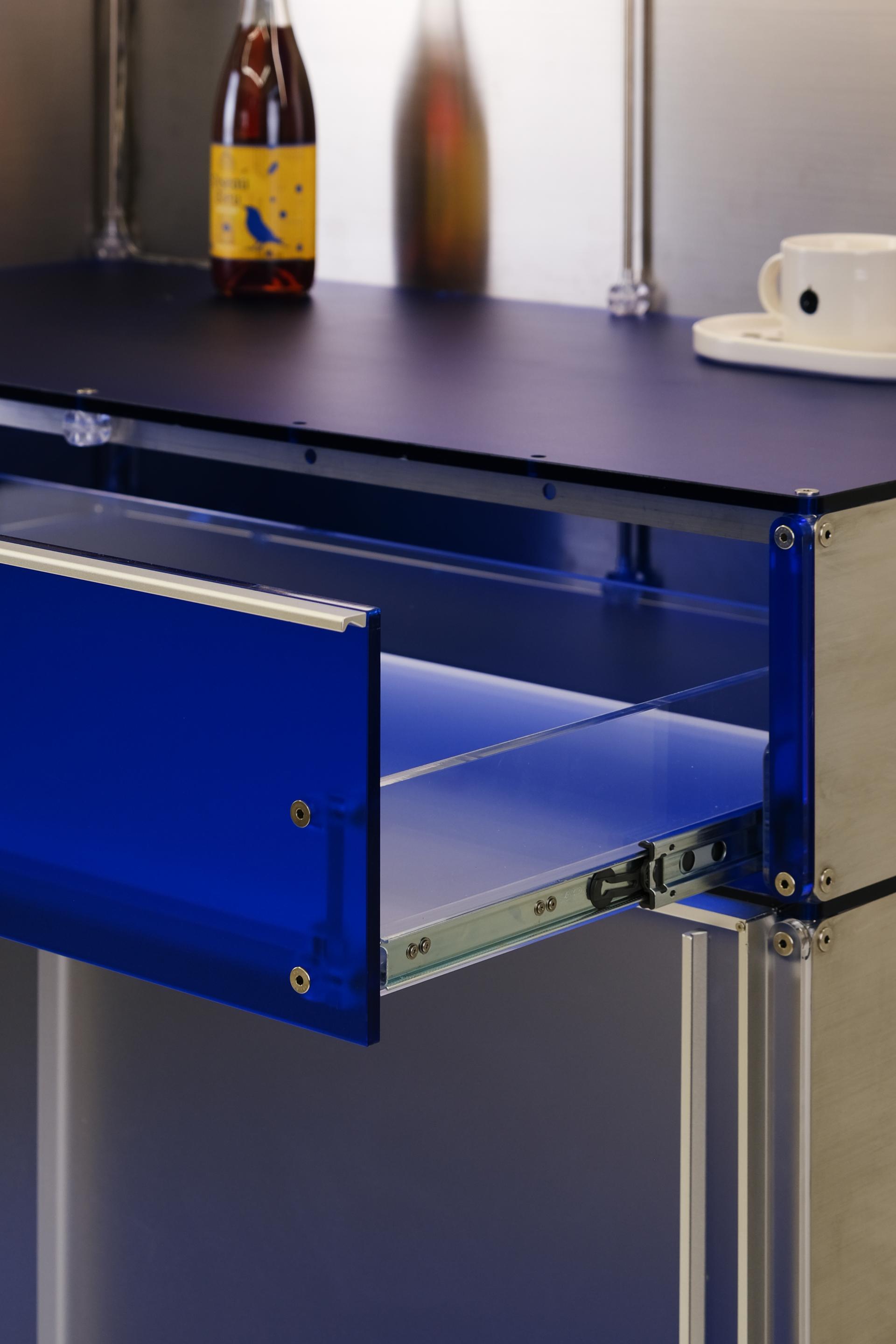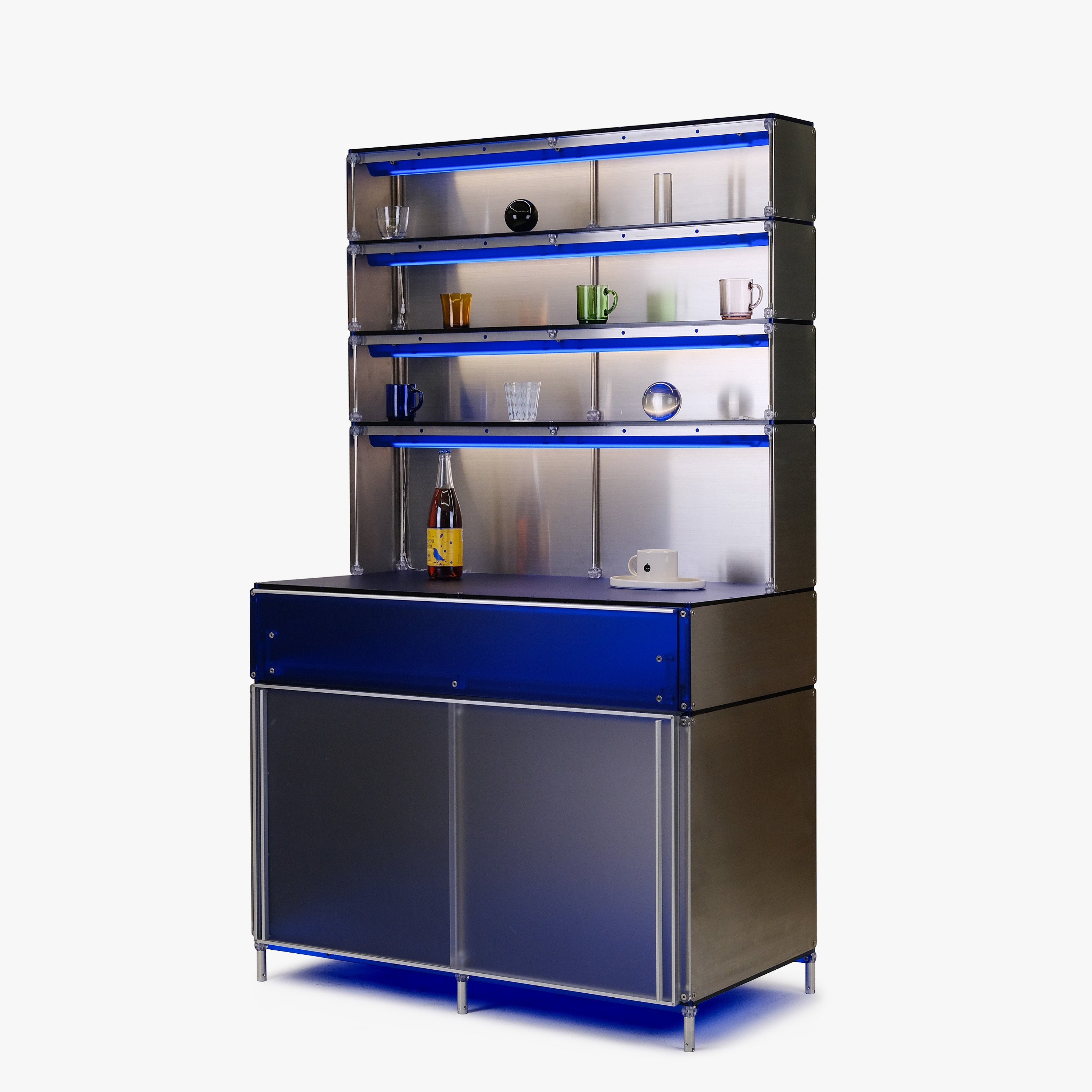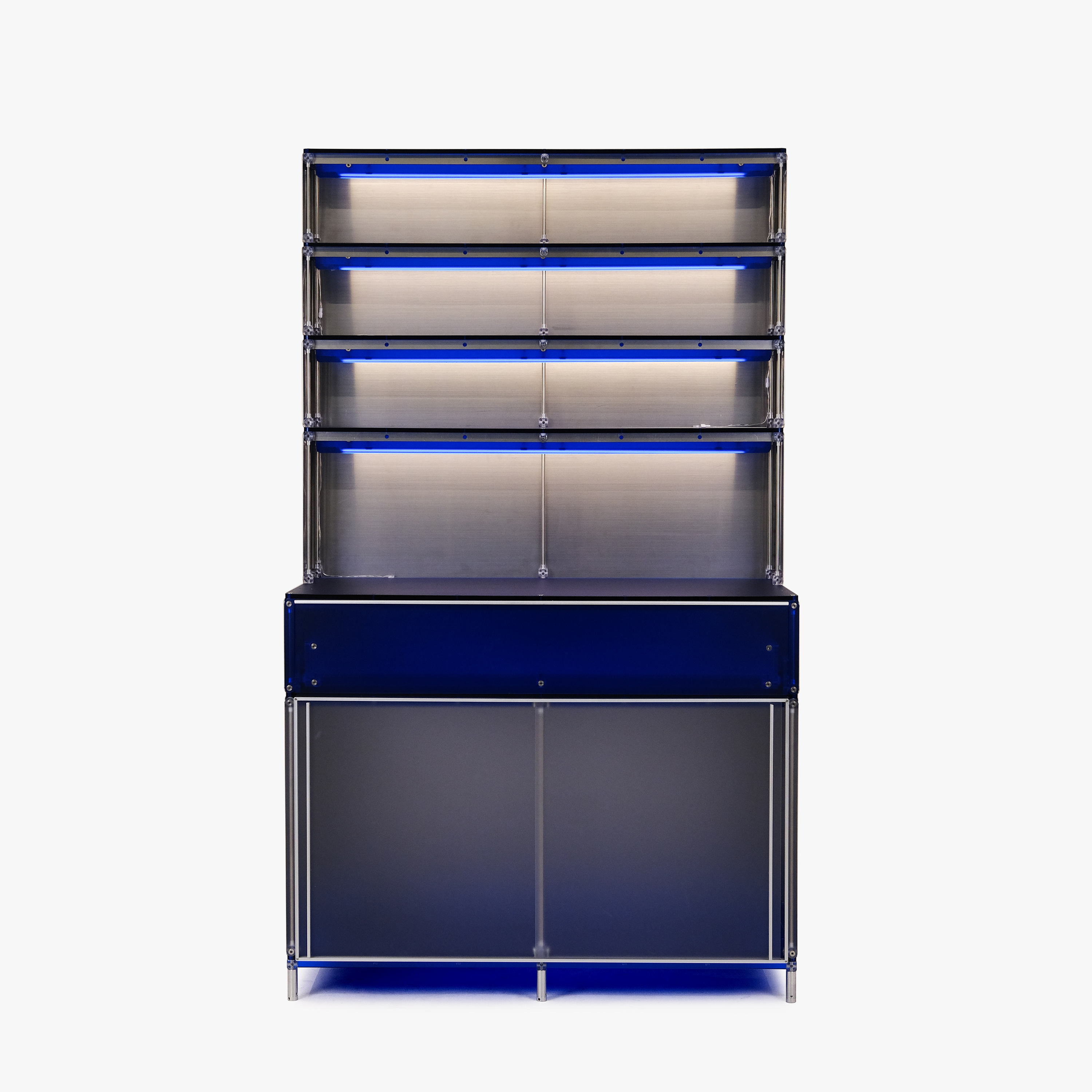 F&B 상업공간에서 키친웨어(도기, 식기, 주방용품 등)를 효과적으로 진열할 수 있는 형태의 집기입니다. 스테인리스 스틸과 로얄 블루 컬러의 아크릴로 구성되어 있습니다. 상부에는 각 단별로 조명이 적용되어 있으며 깊이 206mm의 오픈 선반에 작은 컵이나 도기를 효과적으로 진열할 수 있습니다. 902mm 높이의 중간 선반은 서비스 테이블로 활용될 정도의 충분한 면적을 제공합니다. 하부에는 식기류를 효과적으로 수납할 수 있는 서랍과 큰 부피의 상품이나 재고를 보관할 수 있는 슬라이딩 도어가 적용된 보관함으로 구성되어 있습니다.