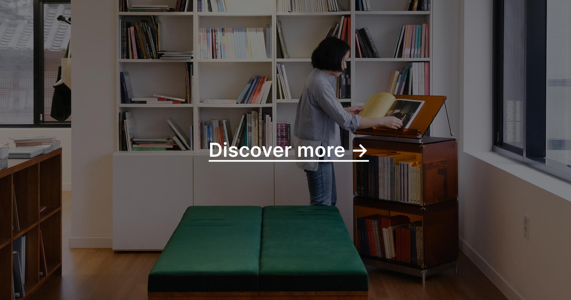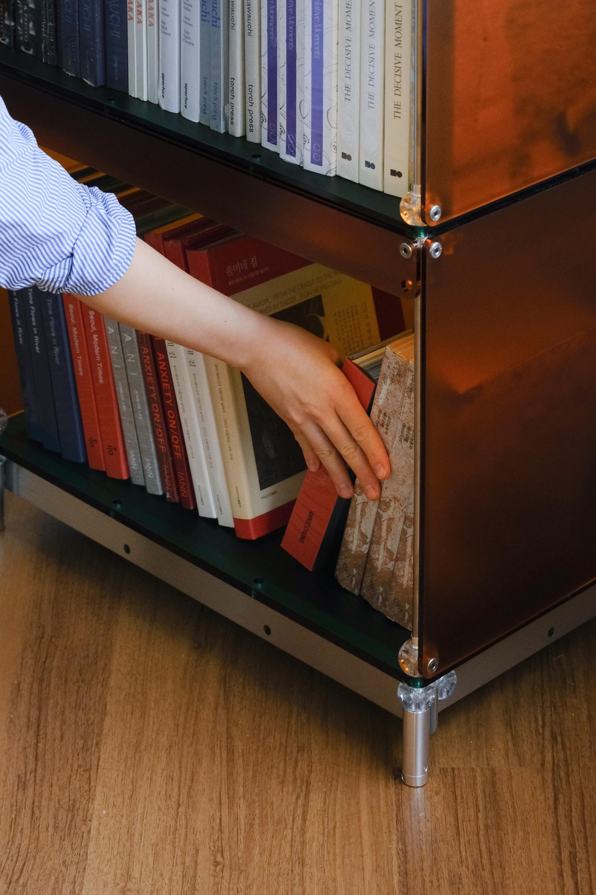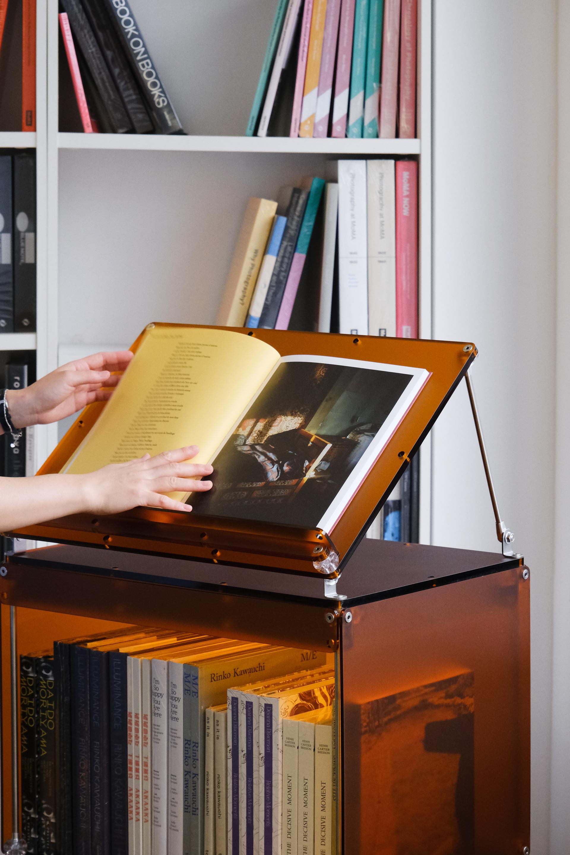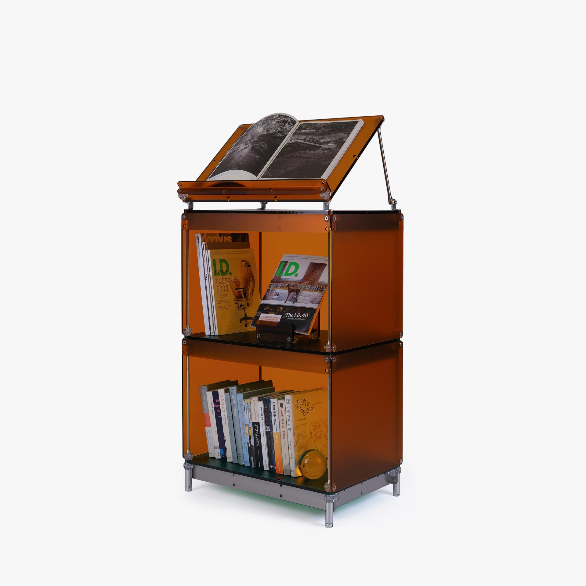 한권의 책을 강조해서 전시할 수 있는 진열장입니다. 상부 슬로프 옵션 위에 강조하고 싶은 책을 펼쳐서 진열하고 고객들은 자유롭게 넘겨보면서 전시를 관람할 수 있습니다. 전체적으로 어두운 톤의 목재와 어울릴 수 있는 다크브라운 컬러를 적용하고 내부 선반에는 포인트로 리프 그린 컬러가 적용되었습니다. 587mm의 폭에 구조보강이 적용되어 한 칸당 120kg까지 책을 적재할 수 있으며 구조보강 스테인리스 스틸 위에는 다크브라운 컬러의 커버를 추가해 재료의 통일성을 주었습니다.