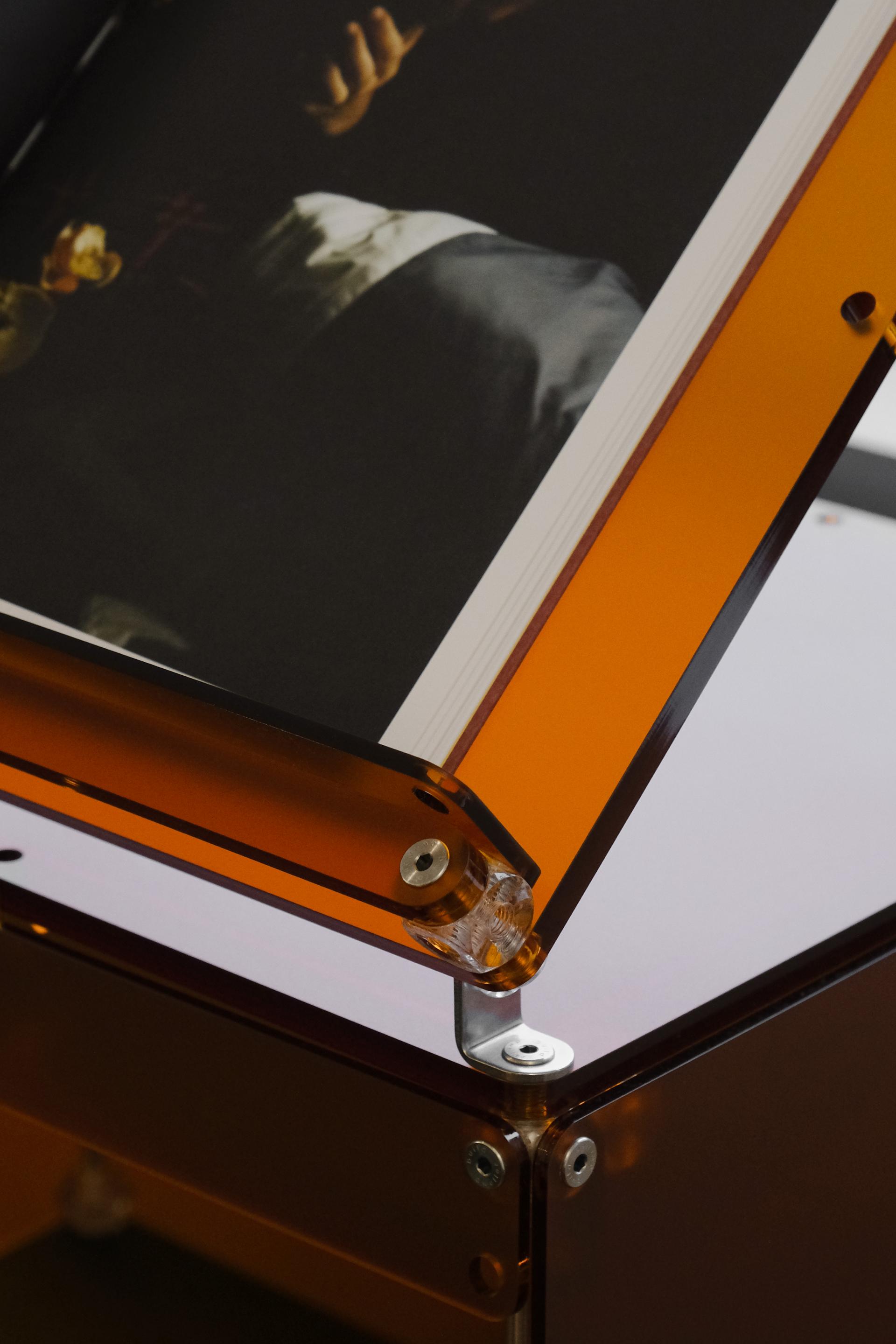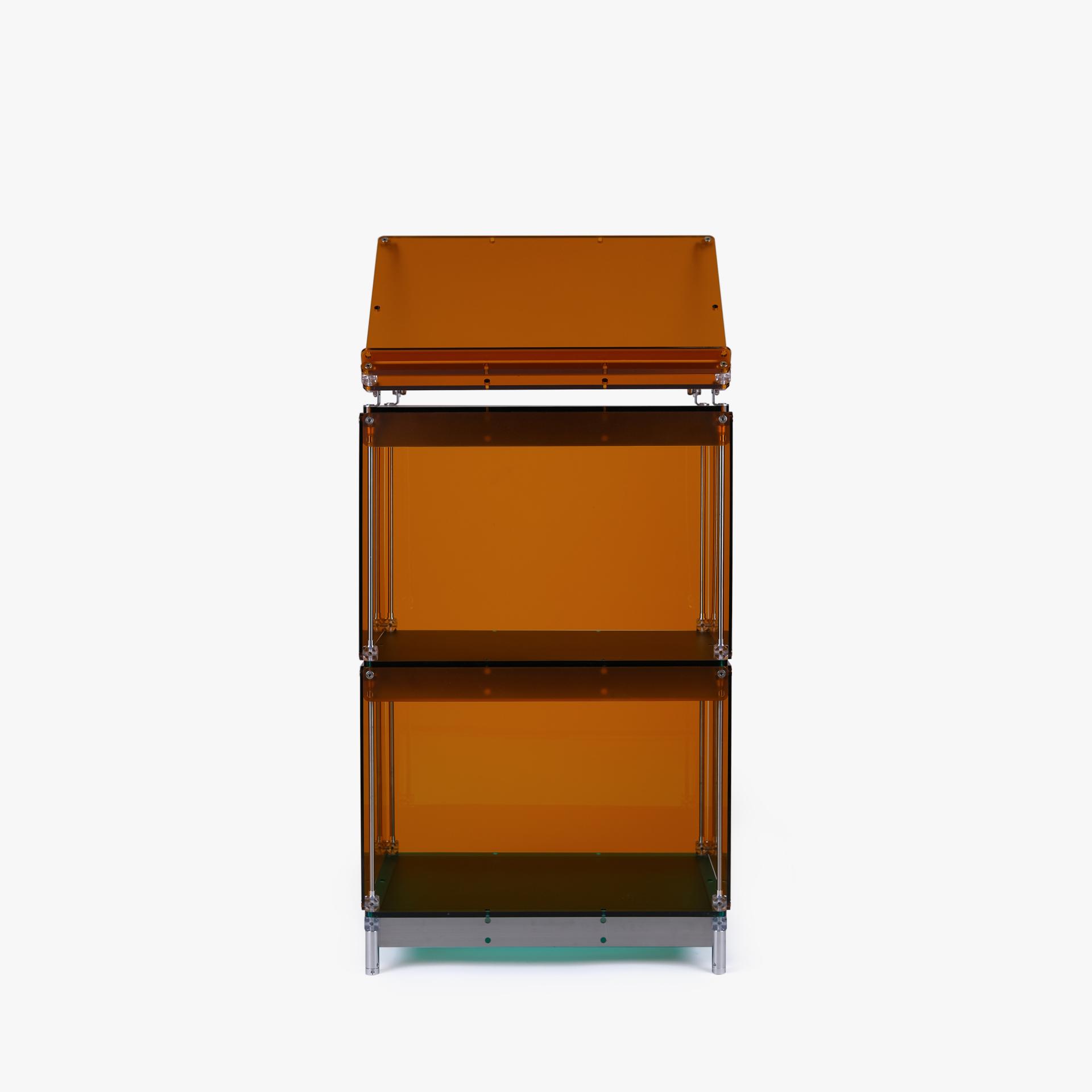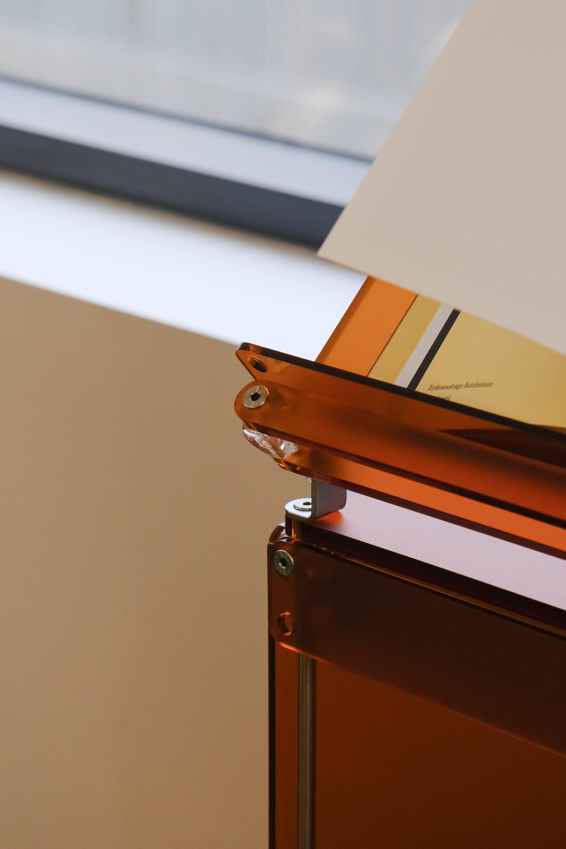한권의 책을 강조해서 전시할 수 있는 진열장입니다. 상부 슬로프 옵션 위에 강조하고 싶은 책을 펼쳐서 진열하고 고객들은 자유롭게 넘겨보면서 전시를 관람할 수 있습니다. 전체적으로 어두운 톤의 목재와 어울릴 수 있는 다크브라운 컬러를 적용하고 내부 선반에는 포인트로 리프 그린 컬러가 적용되었습니다. 587mm의 폭에 구조보강이 적용되어 한 칸당 120kg까지 책을 적재할 수 있으며 구조보강 스테인리스 스틸 위에는 다크브라운 컬러의 커버를 추가해 재료의 통일성을 주었습니다.
