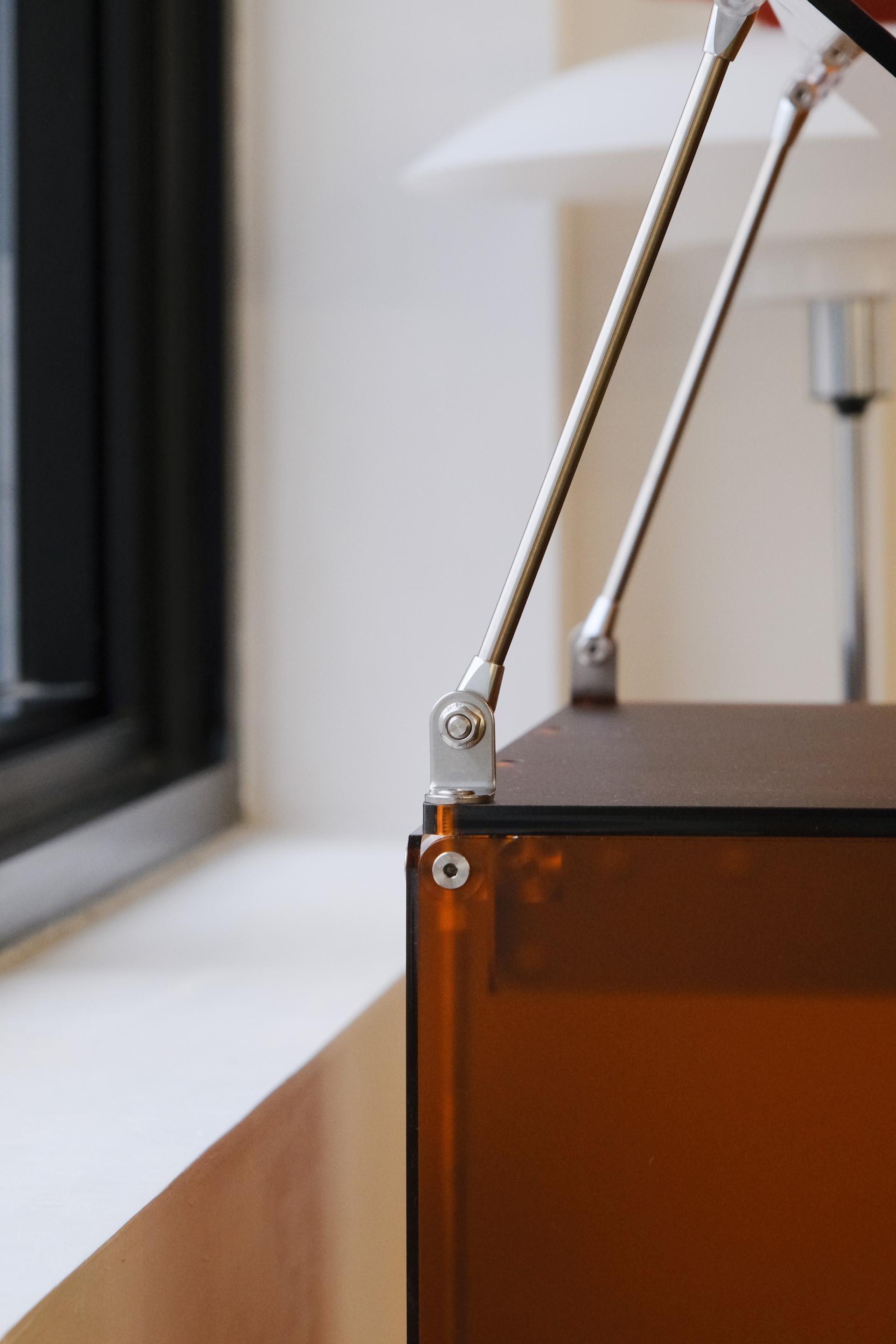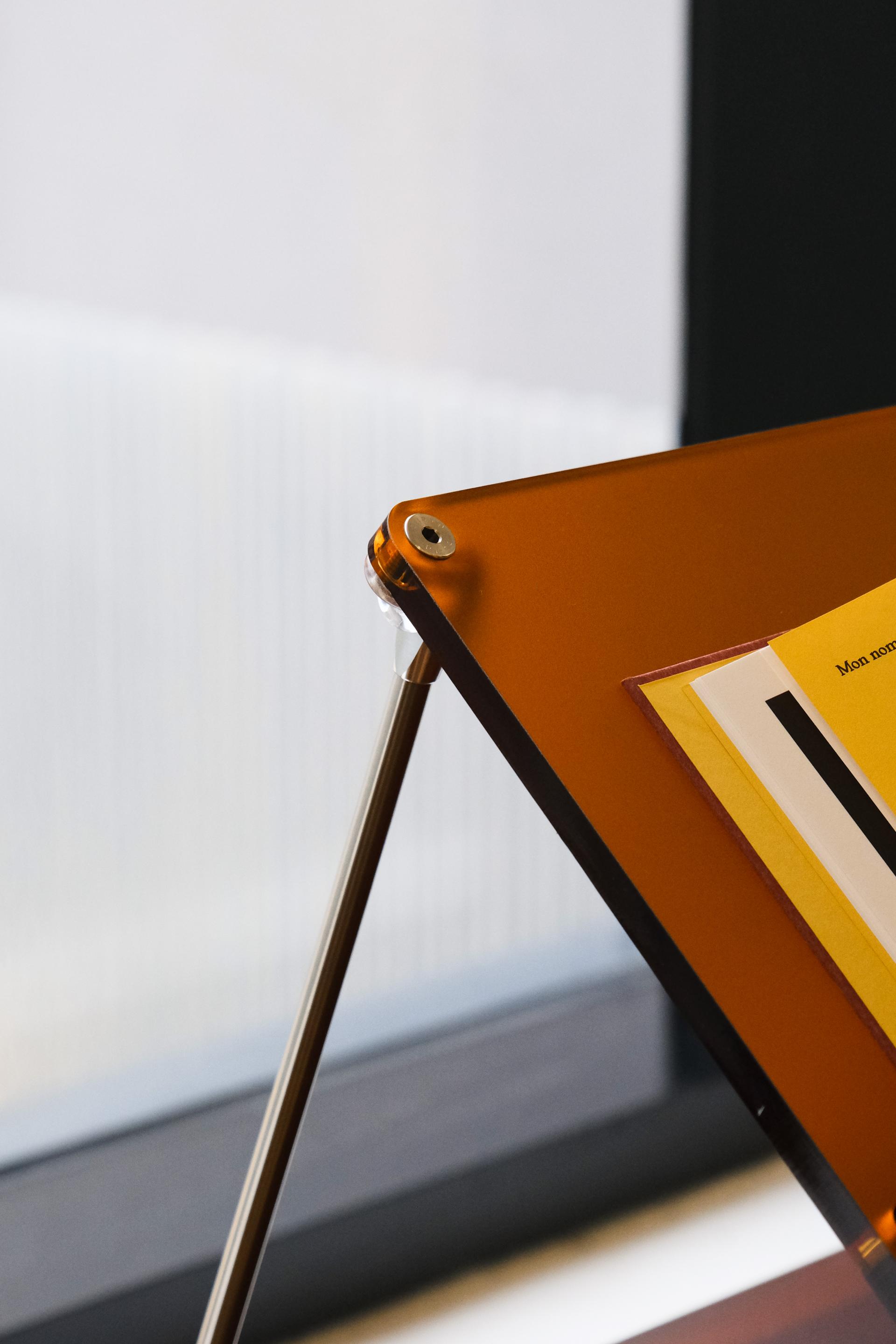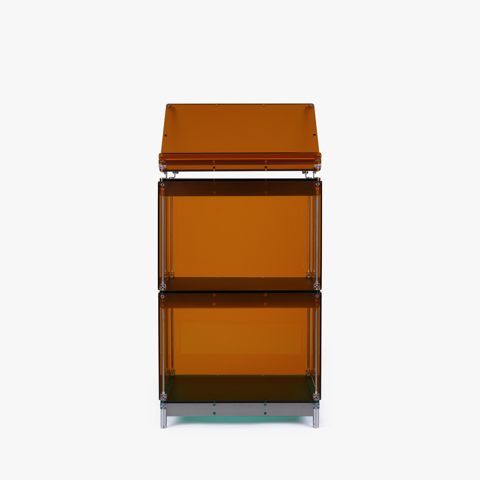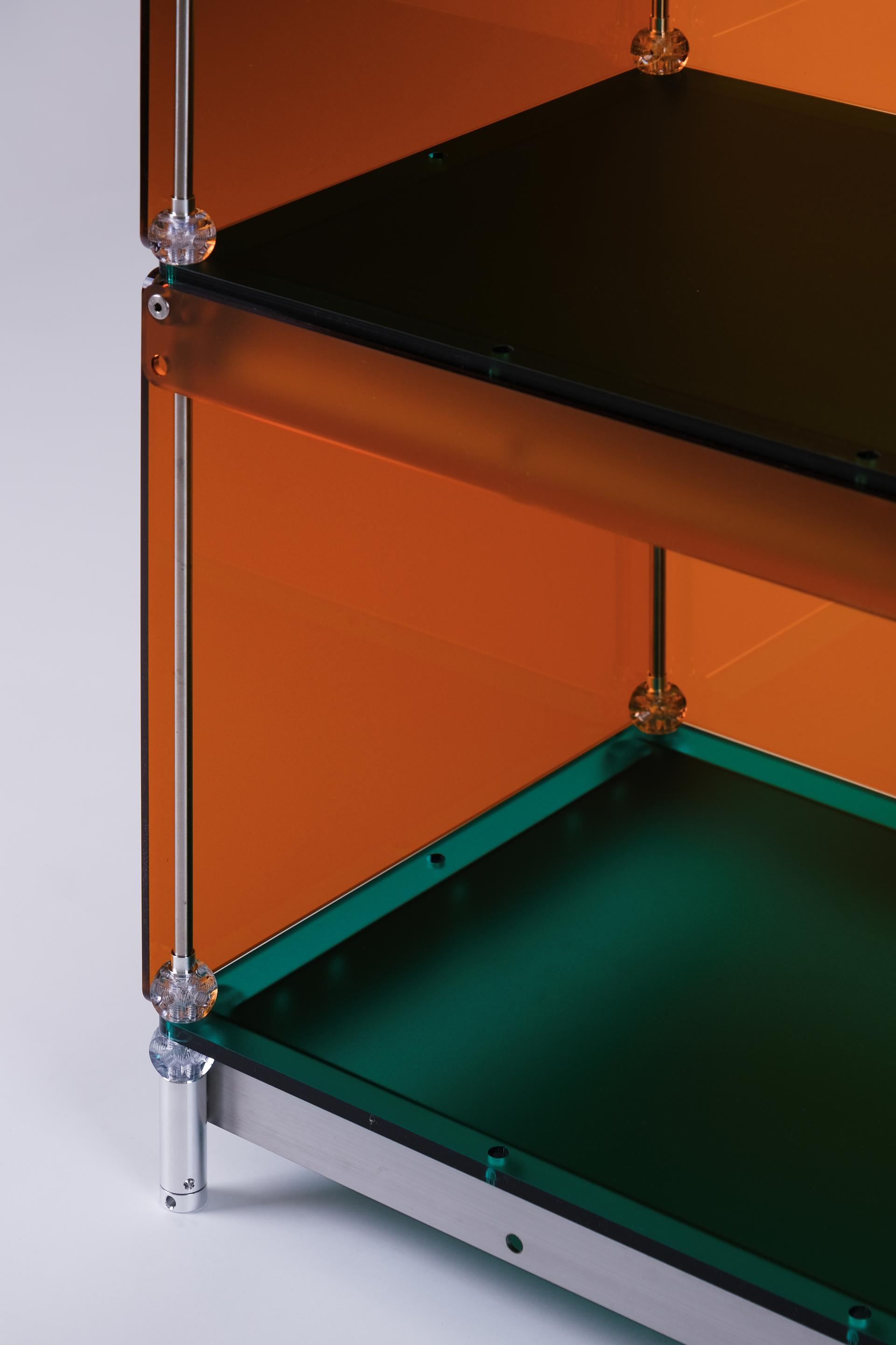 한권의 책을 강조해서 전시할 수 있는 진열장입니다. 상부 슬로프 옵션 위에 강조하고 싶은 책을 펼쳐서 진열하고 고객들은 자유롭게 넘겨보면서 전시를 관람할 수 있습니다. 전체적으로 어두운 톤의 목재와 어울릴 수 있는 다크브라운 컬러를 적용하고 내부 선반에는 포인트로 리프 그린 컬러가 적용되었습니다. 587mm의 폭에 구조보강이 적용되어 한 칸당 120kg까지 책을 적재할 수 있으며 구조보강 스테인리스 스틸 위에는 다크브라운 컬러의 커버를 추가해 재료의 통일성을 주었습니다.