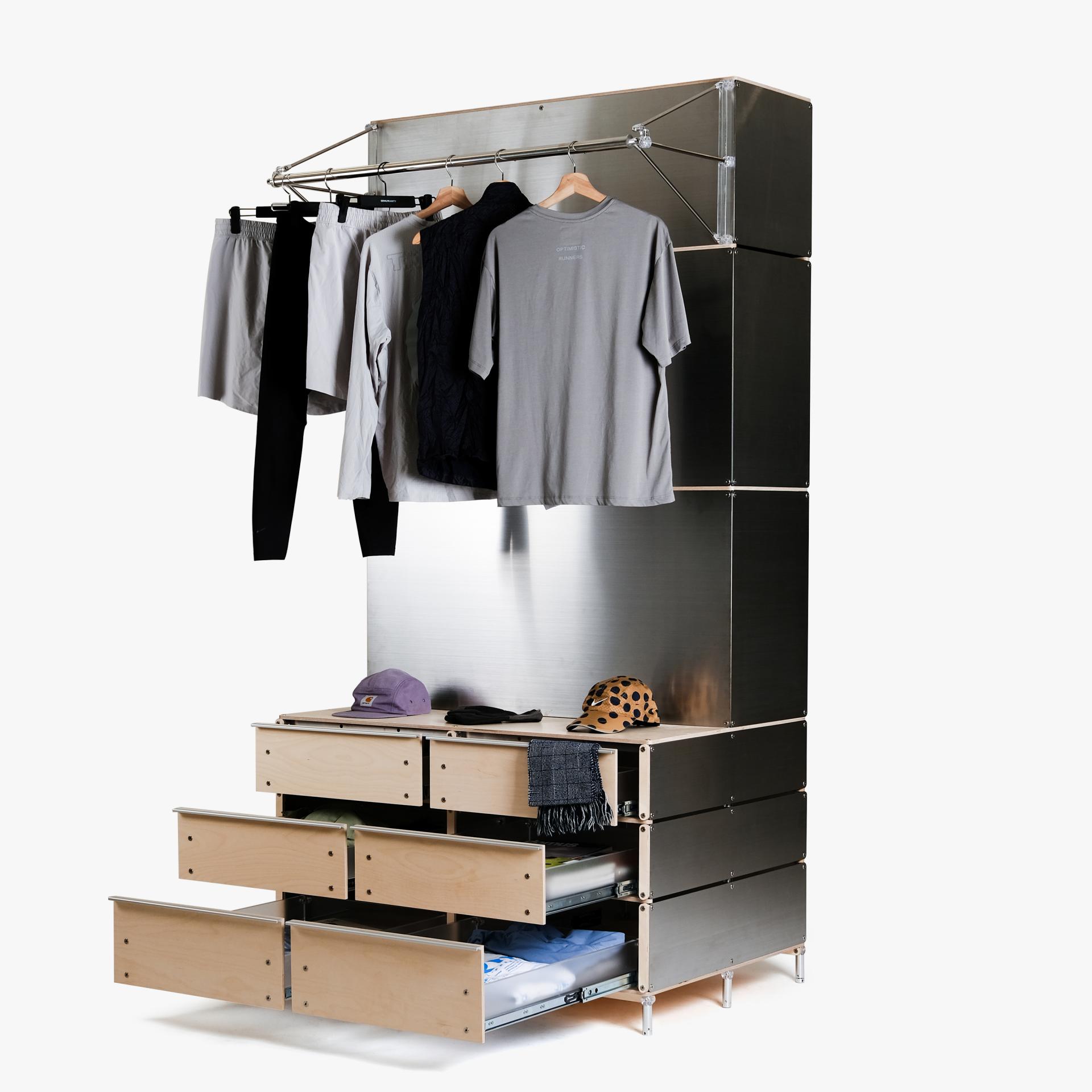 행거로 진열하는 방식은 옷의 너비 때문에 많은 공간을 차지할 수 밖에 없습니다. 하부에 6개의 깊은 서랍을 추가하여 재고를 보관할 수 있도록 하고 서랍 윗부분에는 러닝 모자와 악세사리를 진열할 수 있도록 했습니다.
